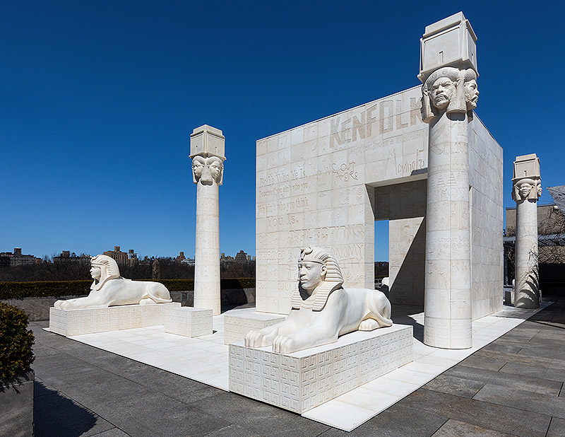 Vista de la instalación The Roof Garden Commission: Lauren Halsey, the Eastside of South Central Los Angeles Hieroglyph Prototype Architecture (I), 2022. © Lauren Halsey. Cortesía de la artista; David Kordansky Gallery, Los Angeles/New York The Metropolitan Museum of Art. Foto: Hyla Skopitz.