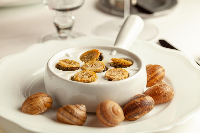 Imágenes superiores: Entrada y caracoles con mantequilla de hierbas
