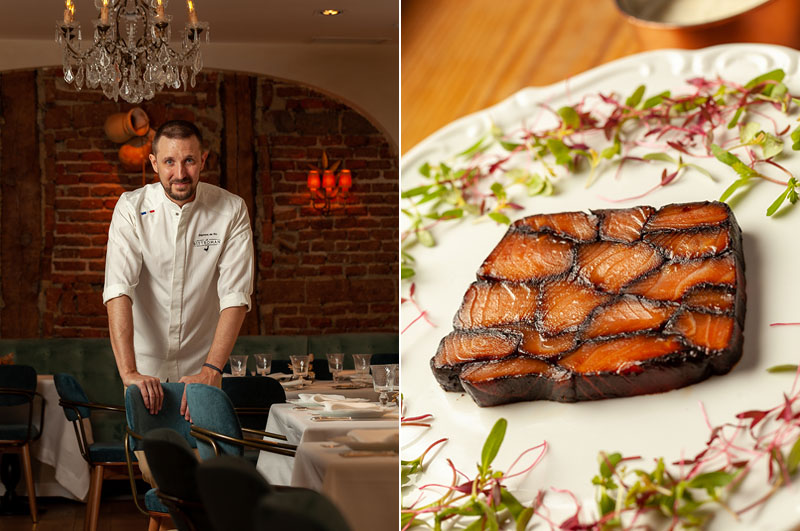 Imágenes superiores: Vista de la sala / el chef Stéphane del Río y salmón marinado con salsa raifort