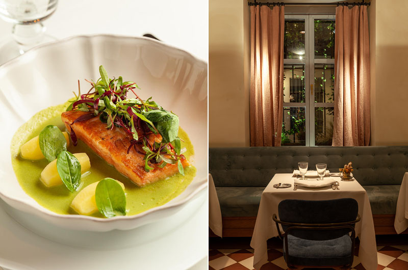 Imagen superior: Salmón con acederas y una de las mesas de Le Bistroman Atelier