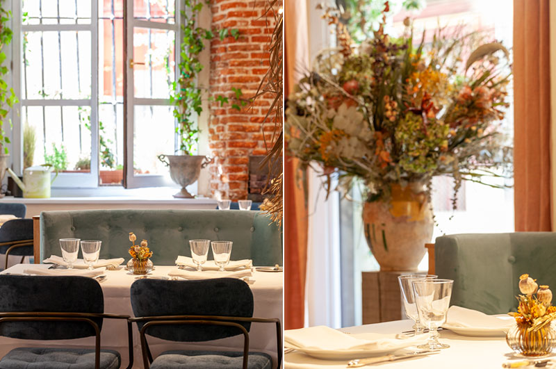 No defrauda dentro su rica puesta en escena: ladrillo visto, lámparas de araña, detalles campestres y, sobre todo, las mesas, vestidas con mantel de hilo perfectamente planchado, al menos antes del parón, vajilla de Limoges, cristalería Riedel, cubertería de plata y cuchillos Opinel para cortar las carnes.