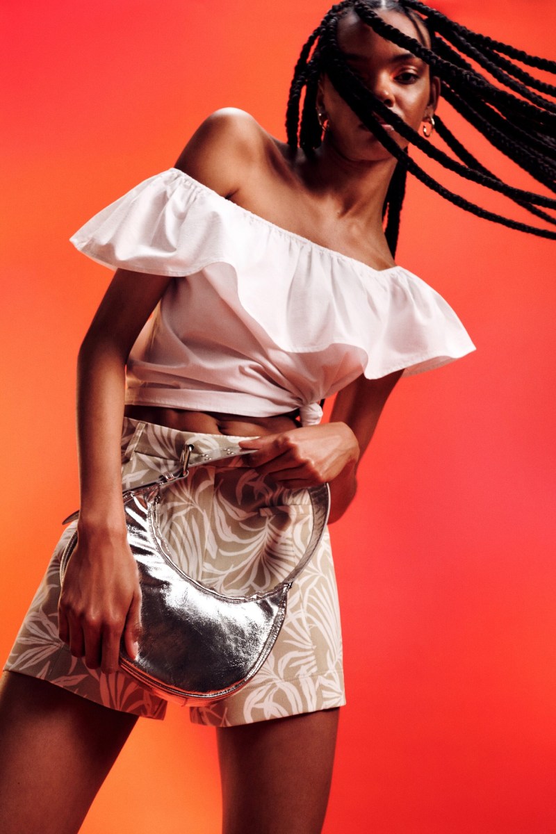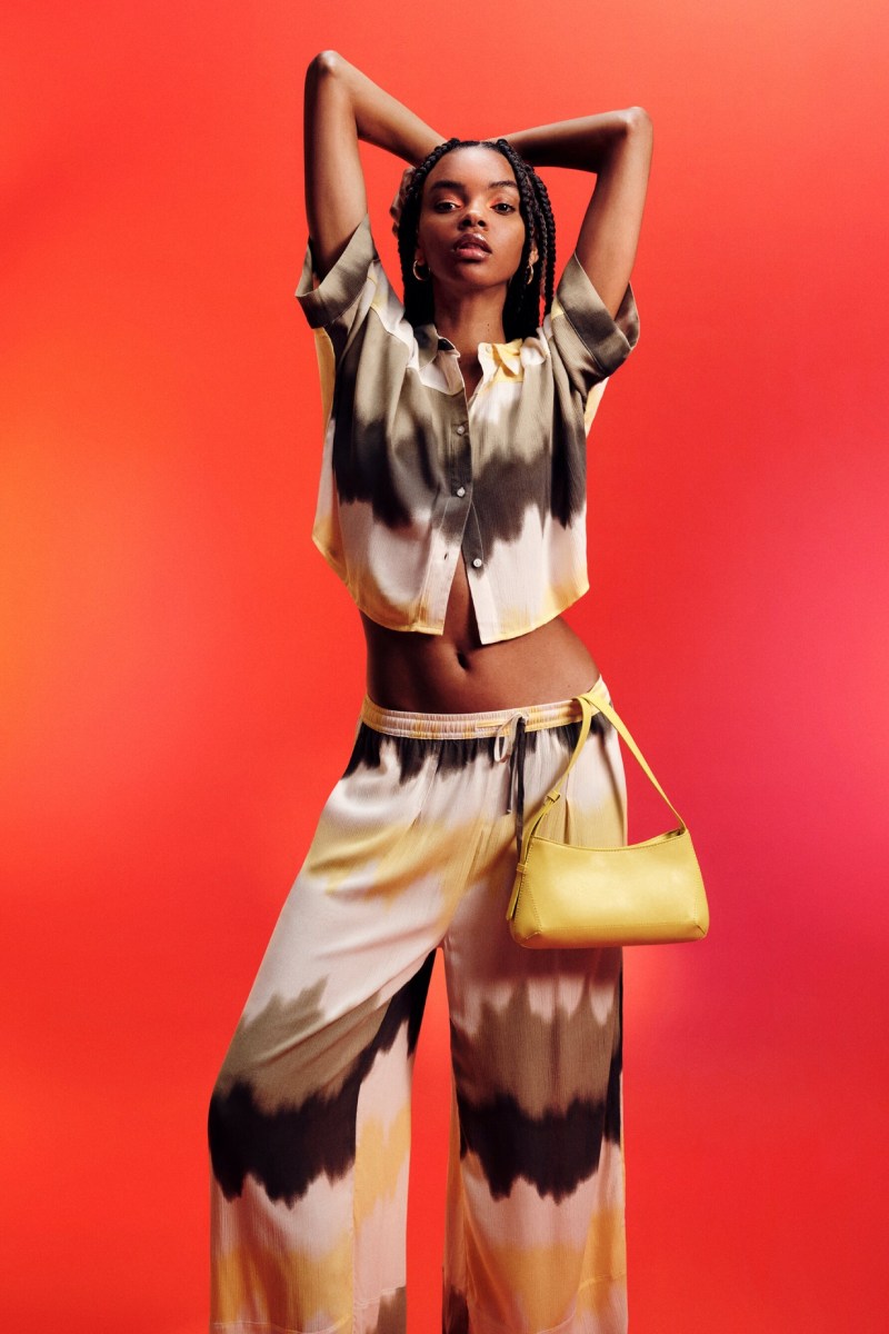 Para esta temporada, Lefties propone como estrella el conjunto de camisa de manga corta y pantalón fluido de cintura elástica. Siguiendo esta vibe de amarillo, nos presenta las piezas en un print de tie-dye lavado que combina distintos tonos de grises, beige y amarillo. O si queréis algo más potente, tenemos la misma camisa con un print integral de pinceladas a tope de saturación. Otro highlight de prendas superiores es su top con volantes en popelín, que brilla por su look simple y color muteado.