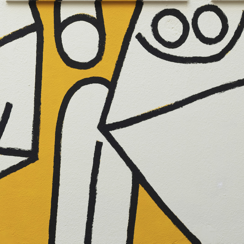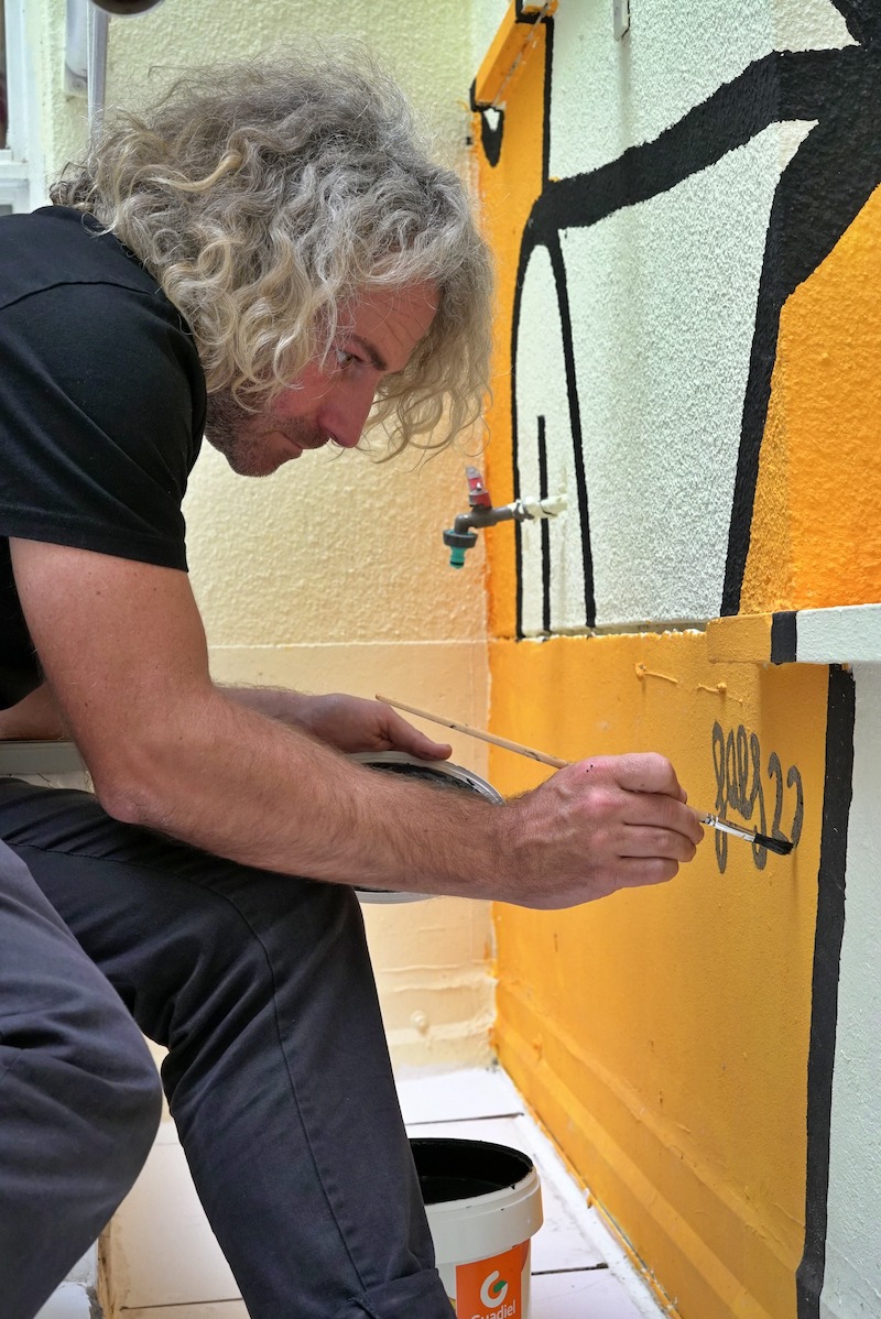 La psicología del color se encarga de la influencia de los colores en el estado de ánimo de las personas. Dicen que Prince o Madonna pedían que las habitaciones de los hoteles estuviesen pintadas de color naranja crema porque genera comfort. Por eso Legaho, el mural de Juan Díaz-Faes en el patio de luces de la escuela de arte TAI, con el amarillo de sus figuras servirá para que los estudiantes sientan confort y calma en combinación con el azul de las ventanas y del cielo.