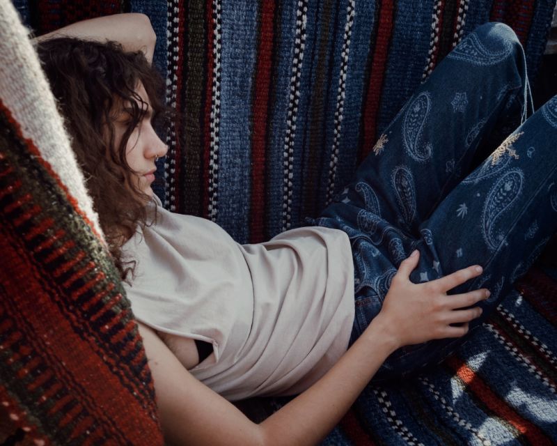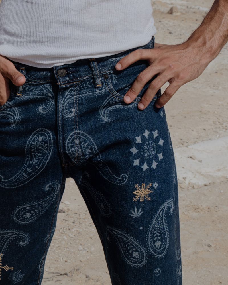 Los jeans están disponibles en los clásicos colores crudo e índigo con estampado paisley y de color bronce. Además, las prendas están fabricadas con una mezcla de algodón y cáñamo, ideales para la temporada que comienza.
