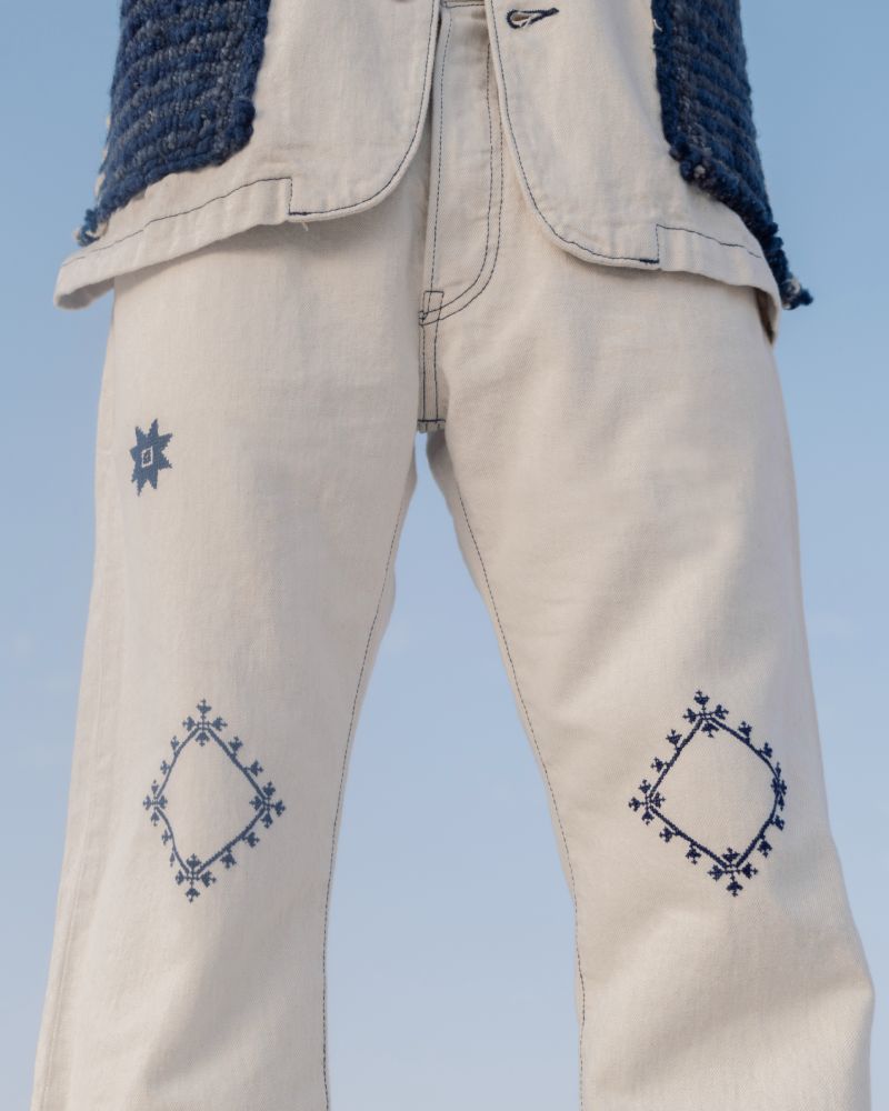 Levi’s x Adish nos enseña nuevas formas de ver el denim. En esta ocasión lo hace a través de esta marca de israelí-palestina. El diferencial de Adish radica en interpretar la silueta occidental contemporánea mediante técnicas de confección cuyo origen está en la tradición palestina. Por ejemplo, bordados artesanales de tipo Tatreez o la utilización de tejidos beduinos creados por mujeres en la Palestina ocupada.