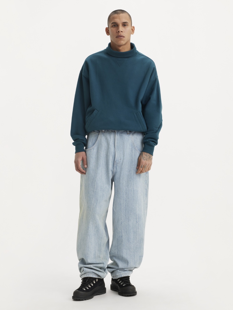 También, los nuevos looks de tendencia skater se coronan con una cazadora de estilo varsity de pana negra con detalles amarillos y un cuello camisero. Y en el terreno más street, tenemos una sudadera de corte oversize con cuello mock en teal. Pasando a los jeans, el meollo del asunto, la colección presenta los vaqueros Stacked Baggy Fit, de corte exageradamente holgado.