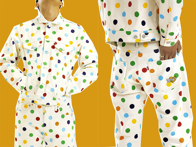La nueva colección cápsula de Levi’s x Golf rediseña el clásico jean 501 y la Trucker Jacket de Levi’s en una colorida versión que consigue aunar la estética clásica de las prendas con el característico print de lunares de colores de Golf Wang, presentado por primera vez en su desfile de 2016.
