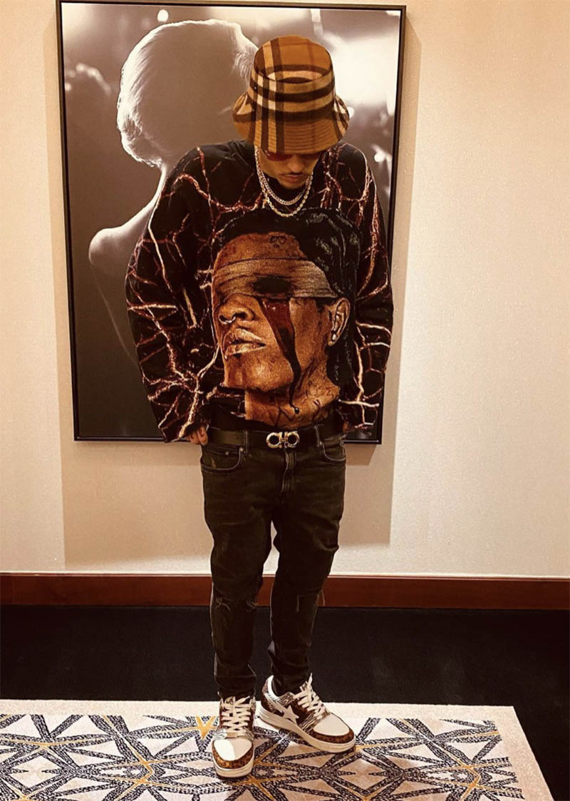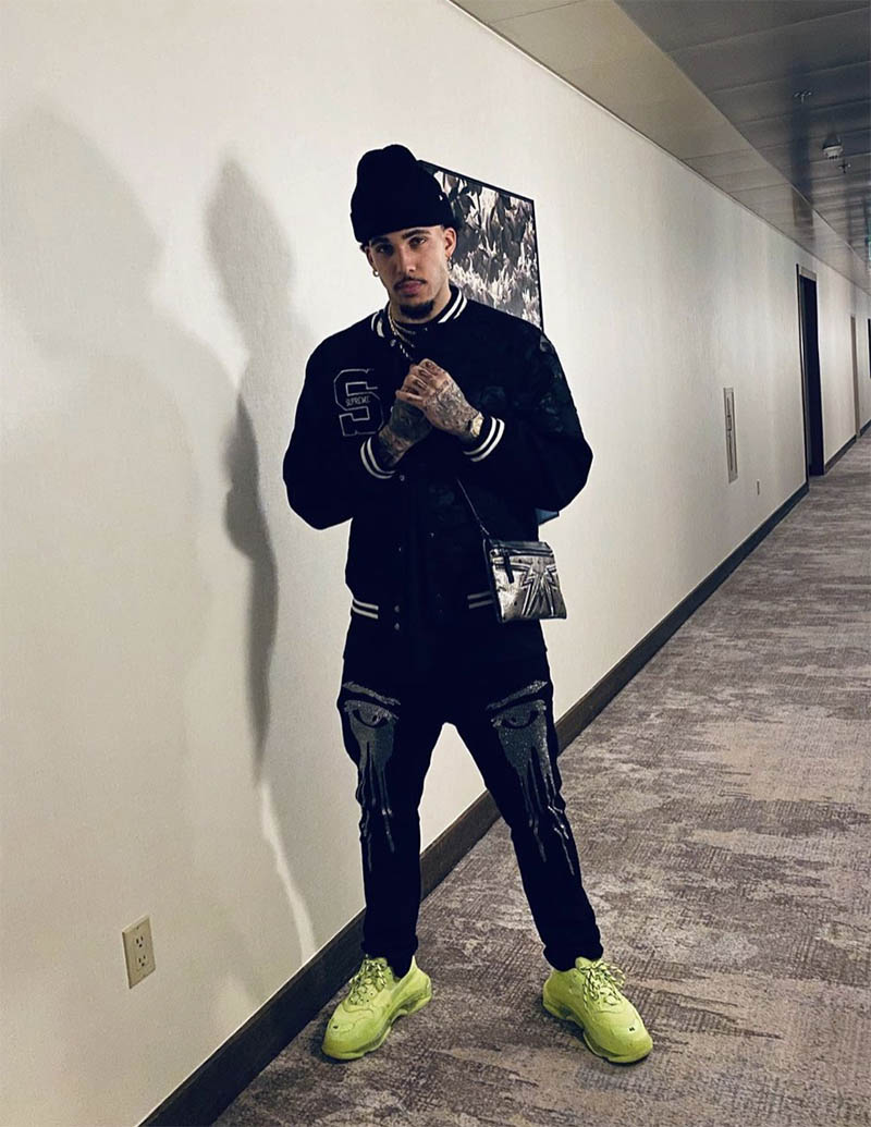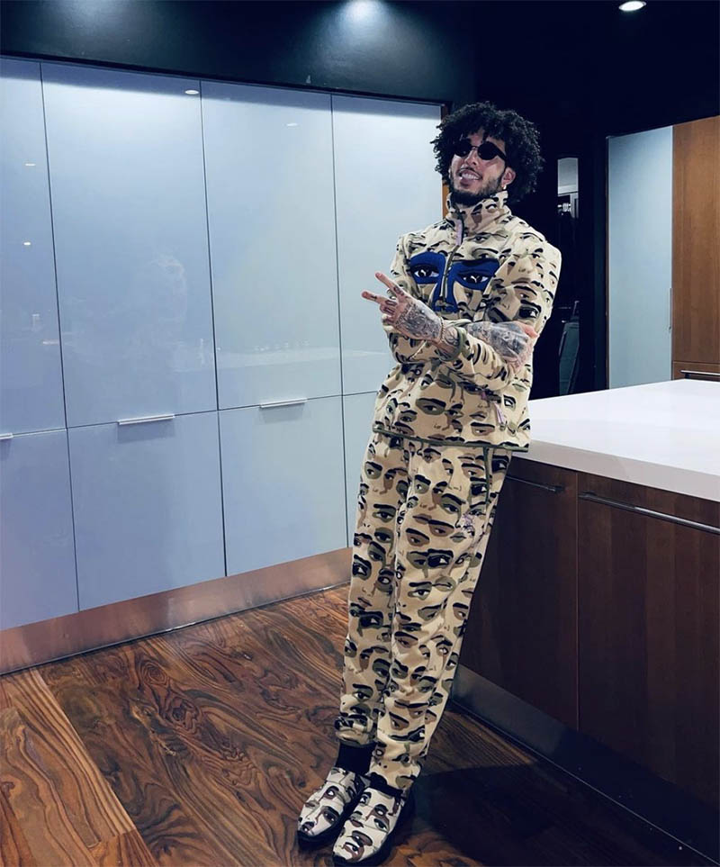 En cuanto al estilo de LiAngelo Ball a la hora de vestir destaca sobre todo la estética urbana y el streetwear que combinan perfectamente con su cuerpo repleto de tatuajes. Encontramos algunas firmas grandes como Kidsuper en este conjunto completo con estampado de ojos formado por chaqueta de chándal, pantalón y zapatos.