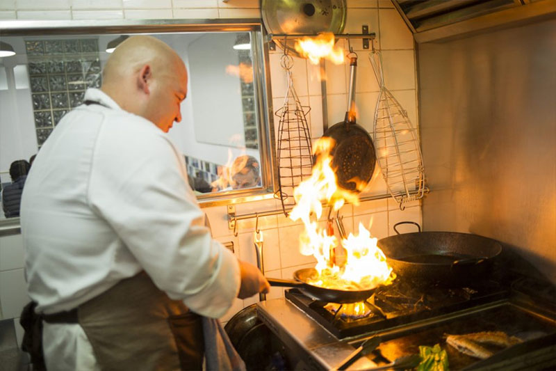 Producto en todas sus condiciones, pero de innegociable calidad. Pescado y marisco ultrafresco, desnudo y pasado por la plancha o directamente tibio, frío, hasta crudo. Javier Caballero oficia en la cabina del fuego, blindada al humo por un potente tubo extractor. En esta marisquería la fritanga es motivo de excomunión.
