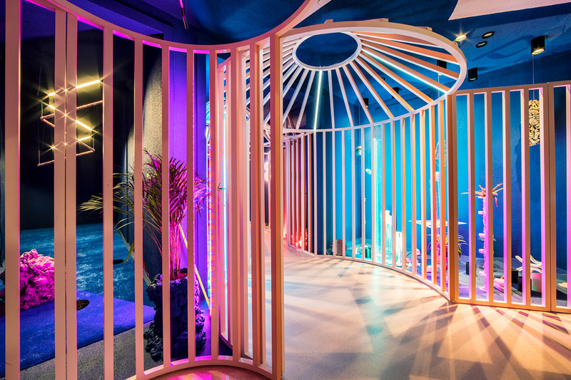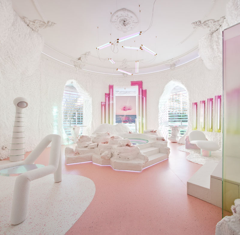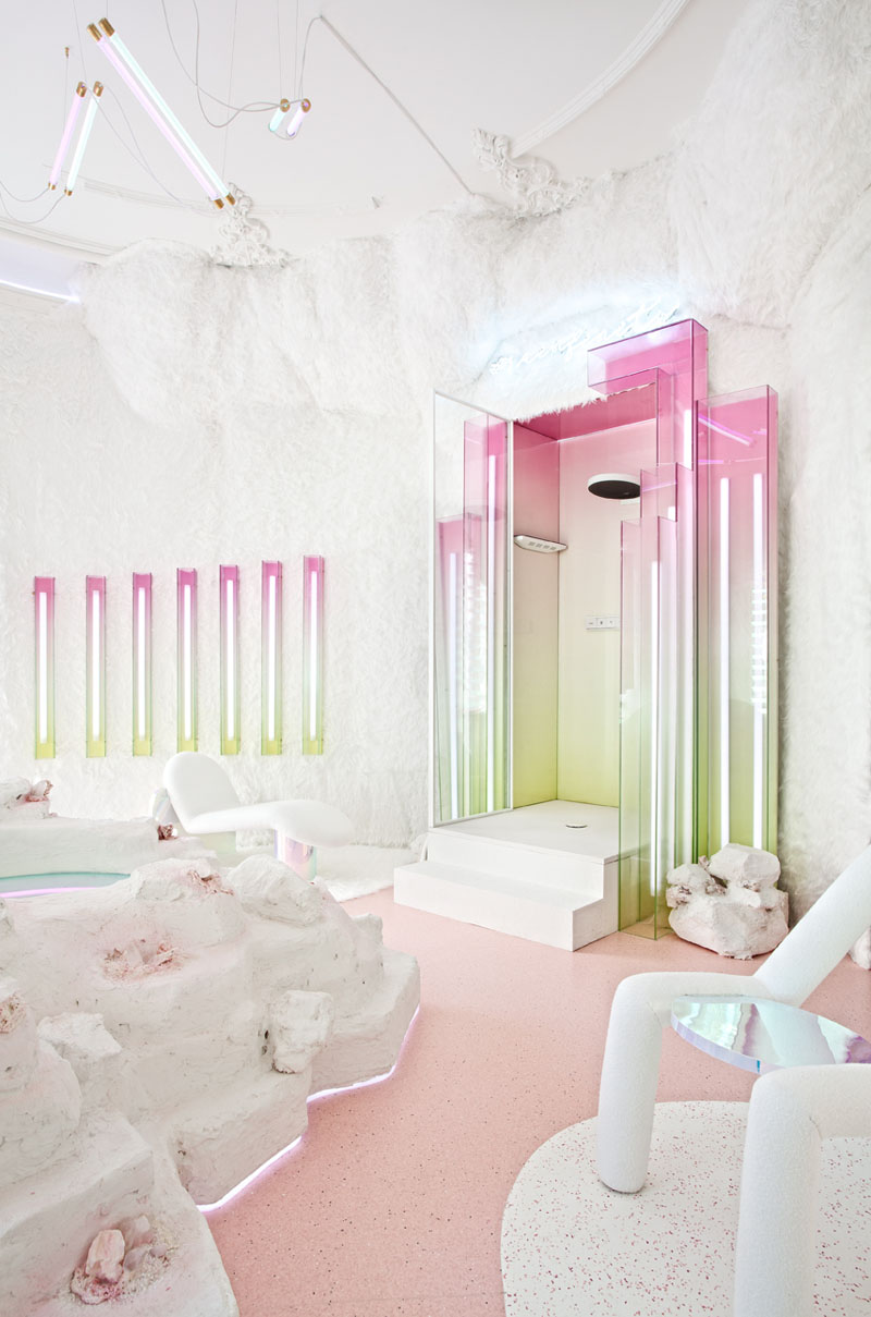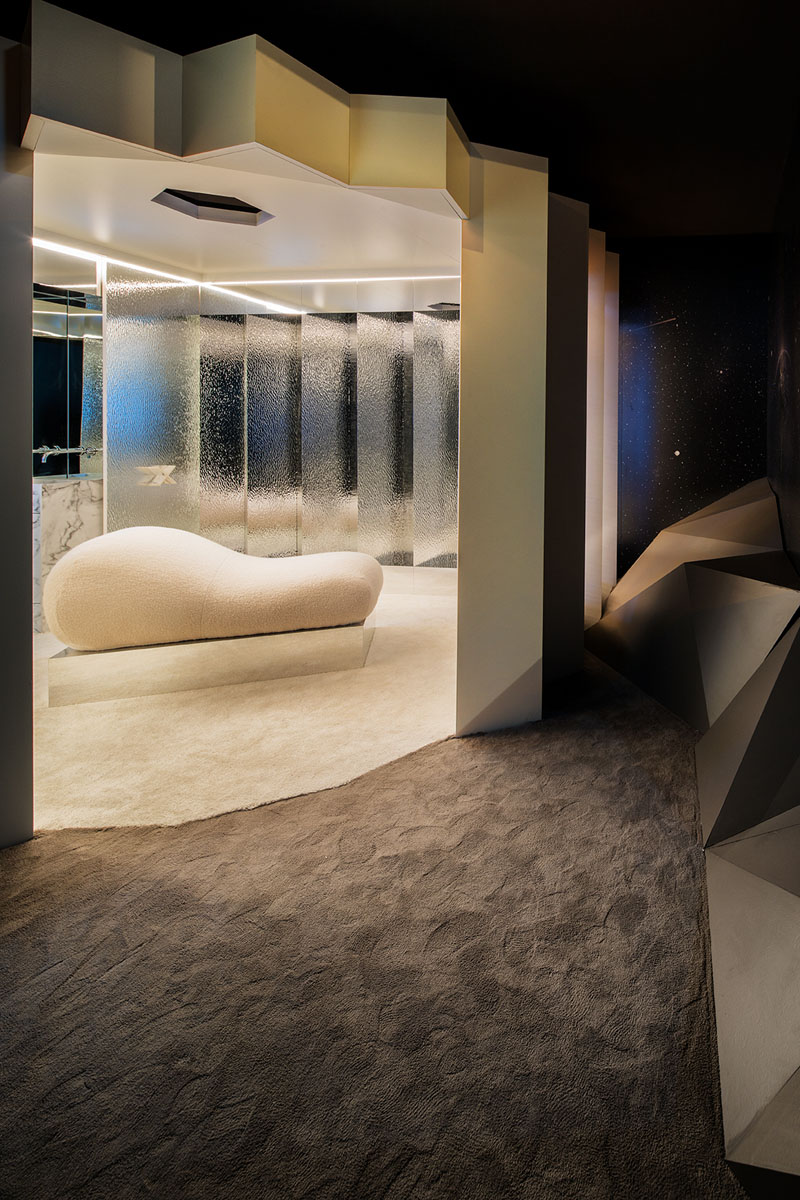 MATERIALES En la era de la sobresaturación sensorial necesitamos buscar espacios que inviten a la contemplación. Todo el espacio está forrado de un manto de pelo blanco inmaculado que nos transporta a una caverna. El material del suelo adaptable, sostenible y acústico así como los infinitos vidrios en colores degradados convierten “Metanoia” en un bálsamo para nuestras mentes aceleradas y necesitadas de calma.