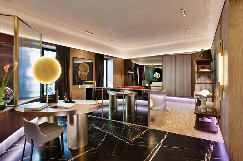 MATERIALES Madera de nogal, vidrios, latón, mármoles de diferentes tipologías, suelos de madera artesanales y revestimientos en cal hidráulica.