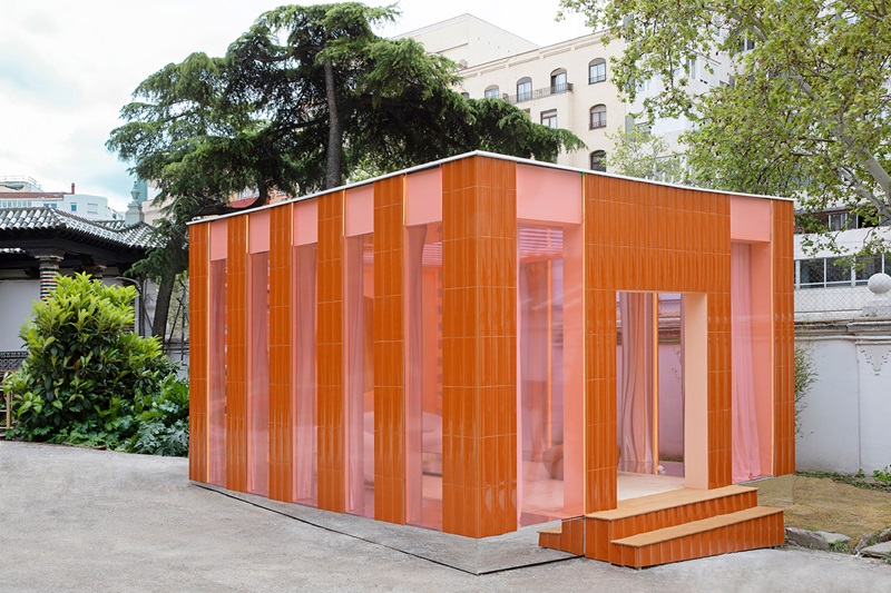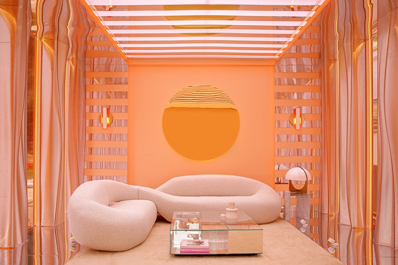 En los jardines, pueden contemplarse interesantes propuestas que reformulan la relación entre el espacio interior y exterior, como el pabellón de Natuzzi. Proyectada por el estudio de Miriam Alía, Infinity presenta una pérgola bioclimática con una paleta fluorescente de tonos rosas y naranjas. El diseño se convierte en un oasis de comodidad, donde reinan múltiples texturas. La suavidad de la alfombra que cubre la totalidad del suelo, las columnas de plástico reciclado fabricadas con impresión 3D y las piezas cerámicas de estilo mediterráneo.