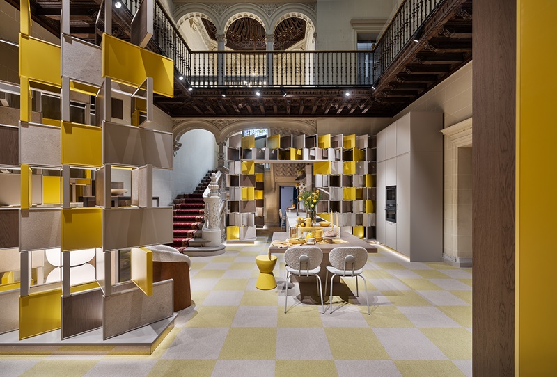 La identidad de Espacio Dica está marcada por el alegre color amarillo y el divertido juego de geometrías creadas por Estudi{H}ac. El equipo de José Manuel Ferrero ha convertido el majestuoso hall central del Palacio en una deslumbrante cocina de doble altura, presidida por una gran isla de piedra. El diseño utiliza la celosía, como principal elemento organizador, y la moqueta modular, para dar carácter al suelo.