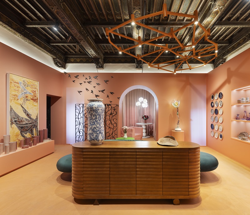 En el salón principal del Palacio, 19 artesanos castellano-manchegos ponen en valor la reinterpretación contemporánea de la tradición artesanal de Castilla-La Mancha bajo el sello Romero & Vallejo. El estudio de arquitectura y diseño ha ideado un escenario de color rosado, que realza el exquisito artesonado del techo, para presentar el selecto conjunto en una atmósfera cálida y coqueta. Además de numerosas piezas cerámicas, encontramos la gran cómoda de madera, un sillón de cartón piedra y el colorido juego de mesa y taburetes de madera policromada.