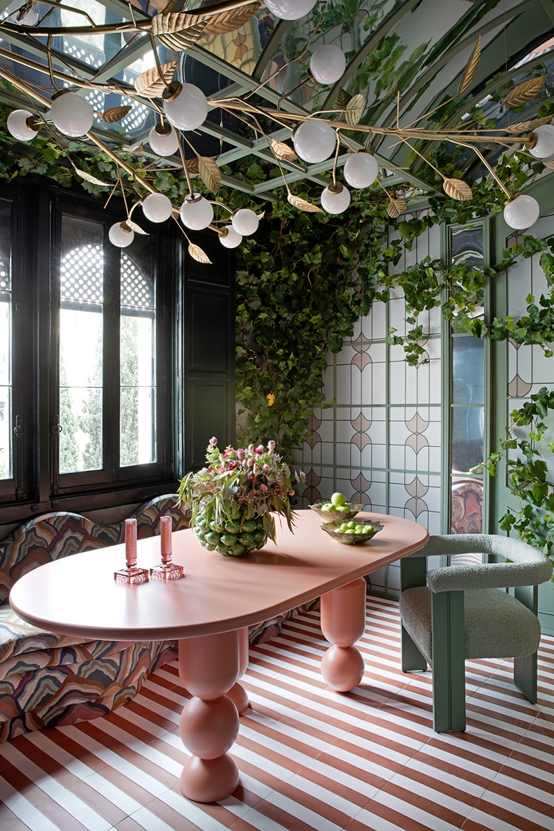 Sacada de un cuento de hadas. Así es la cocina concebida por Virginia Gasch, alma máter del estudio de interiorismo y decoración VG Living, inspirada en las orangeries de las residencias aristocráticas de los siglos XVII y XVIII. El colorido espacio Bella Natura cobra vida en un invernadero habitado por la naturaleza, presente también en la paleta de colores y los elementos de decoración, como las lámparas en forma de rama. El lugar ideal para sentarse a comer y deleitarse con una larga sobremesa, como colofón al recorrido de la segunda planta del Palacio.
