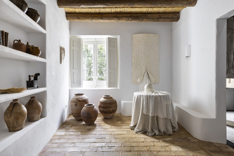 La arquitecta Encarna Alcaide reproduce en Volver… la esencia doméstica de la slow life con una estética de tonos blancos (en las paredes, los textiles y la obra de arte de celulosa) y terracotas (en el suelo de ladrillo de barro, las tinajas y los cántaros). La fundadora de Atmospheras se inspira en las salas de estar de los pueblos interiores de Aragón y la Comunidad Valenciana, propias de los siglos XVIII y XIX, para crear un espacio sumido en la calma.
