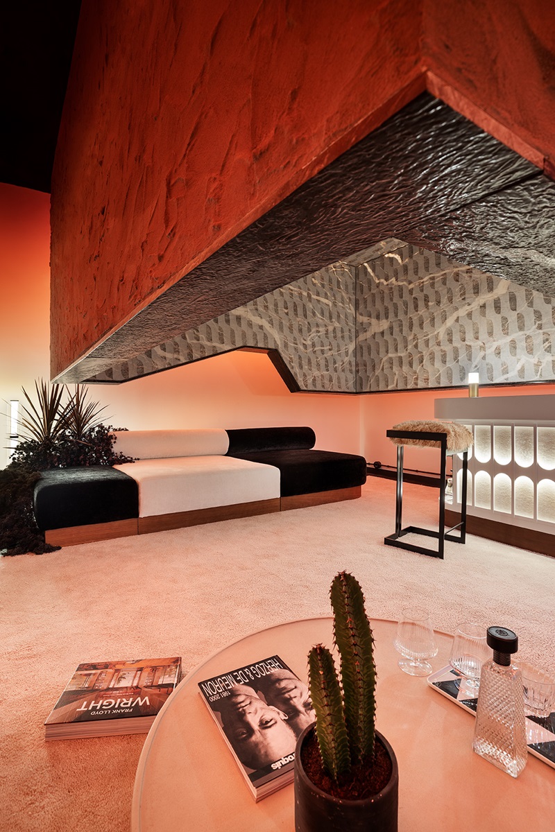En la primera planta del Palacio, hay que experimentar la experiencia de adentrarse en el búnker de Espacio Formica, creado por el estudio de interiorismo Wanna. Una acogedora guarida, pensada para el disfrute, que invita a desconectar del mundo exterior. A cubierto, entre el sensual cromatismo de los laminados que envuelven la estancia de inspiración brutalista.