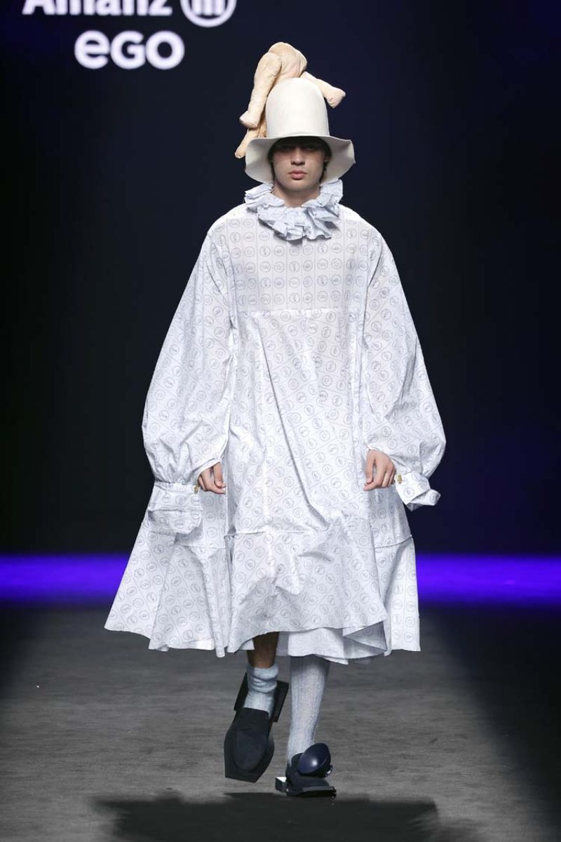 Sabela Juncal es novata en la pasarela de Mercedes-Benz Fashion Talent, pero en la moda no. Ella es diseñadora masculina de Adolfo Domínguez, y para salir de su zona de confort, subió a la pasarela una colección donde juega con las construcciones. “Condominio”, es, sin duda, su proyecto más personal, porque a través de la selección de las telas o sus estampados, ella imagina a habitantes en un hogar que paran el tiempo para dejarse llevar. A Sabela Juncar le gusta experimentar y esta colección, es la viva imagen de lo que tiene en su cabeza a la hora de crear. Gabardinas, amplias chaquetas bicolores, vestidos hasta la rodilla muy amplios o un bolso en forma de pollo. Estas fueron las piezas que brillaron. Sin embargo, todo el mundo amplió el zoom para tener captura en su móvil los zapatos.