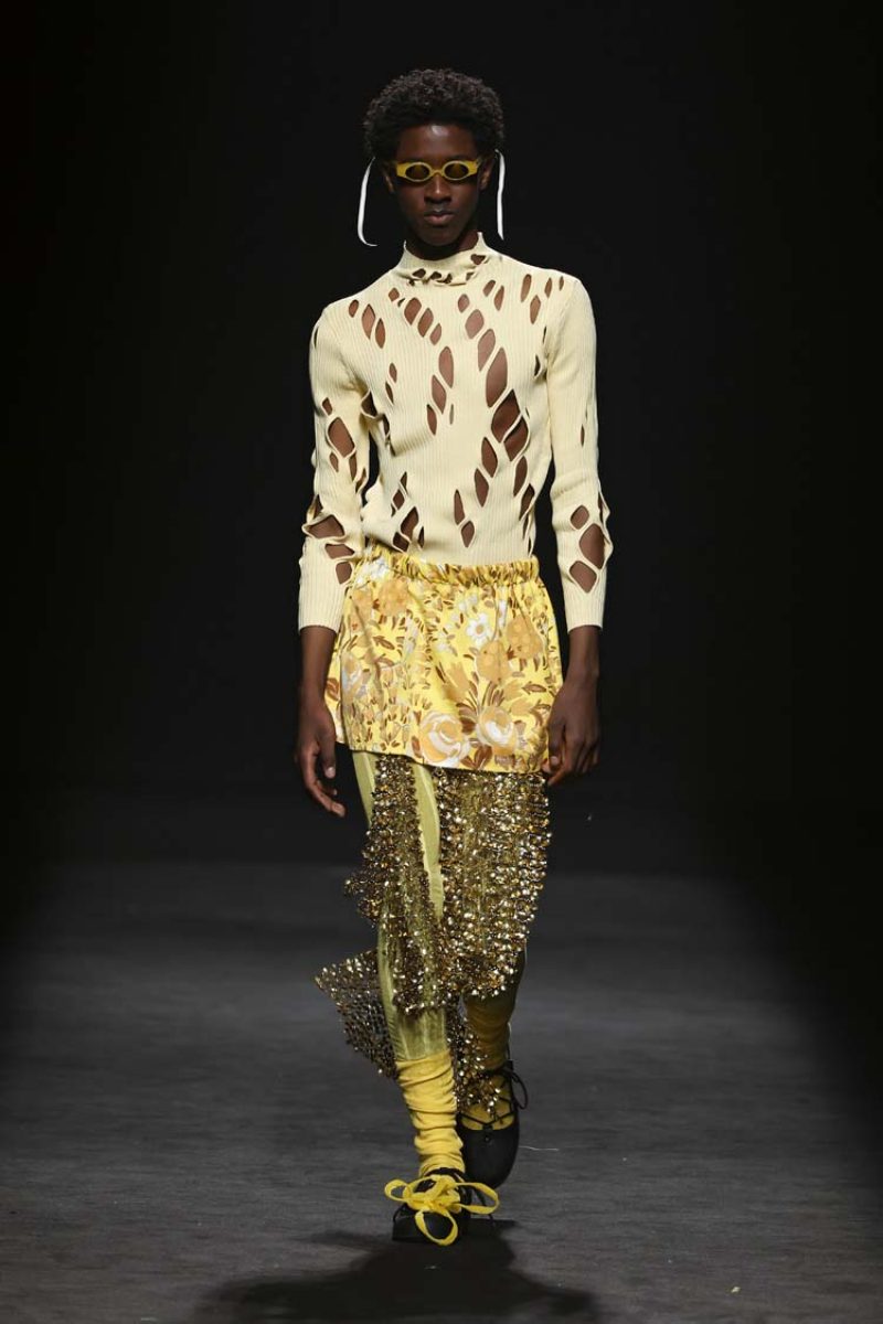 Tras ver la colección de Reparto Studio, tocó el turno de Adrià Egea. Esta marca era todo un misterio, porque no había mucha información en redes sociales. Este diseñador emergente de Badalona (Barcelona), comenzó su interés por la moda, gracias a pasar largas tardes en casa de su abuela. Adrià Egea presentó “Error series 2.0”, una colección que recoge todas sus experiencias y el concepto de la belleza de la inexactitud. Este término lo podemos ver en la amplitud de las telas y como se atrapan en el cuerpo de los modelos. No obstante, las formas permitían un movimiento diferente que marcó el desfile. Todas las prendas no tenían género. Una filosofía que llevan todas o casi todas las firmas.