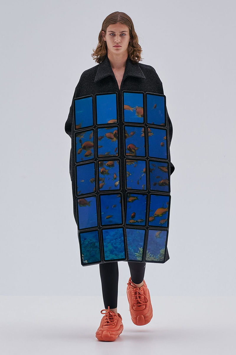 Pero ahora sí, detallando el punto central del desfile de Loewe Hombre SS23, tuvimos un capitulo dentro de la colección donde la naturaleza era la protagonista: abrigos, vaqueros, sudaderas y el clásico Flow Sneaker recibieron un tratamiento de efecto césped que hizo ver a estas prendas como jardines ponibles. Y como contrapunto del elemento natural, jerséis y abrigos fueron la base para pantallas, donde podíamos ver distintas escenas mientras re reproducían.