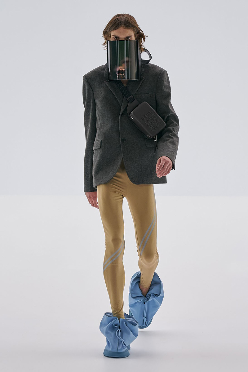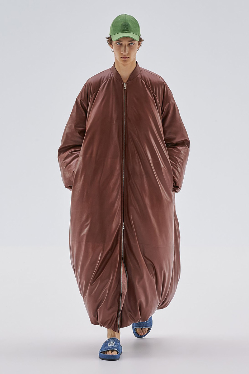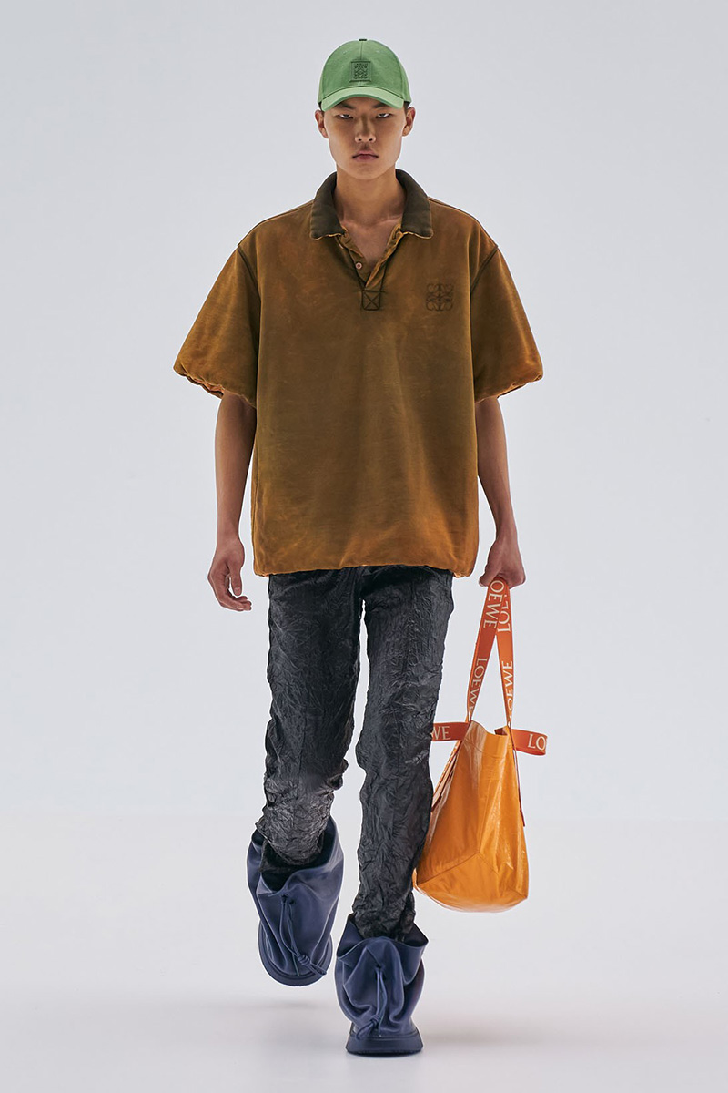 Esta colección nos trajo propuestas de calzado bastante interesantes: una zapatilla estilo abrigo acolchado bastante chunky, un híbrido entre sneaker y bolsa de piel bastante similar al concepto de los Mars Yard de Tom Sachs y otra zapatilla de caña media desgastada. Los bolsos no podían faltar en un desfile de Loewe: vimos el debut del Puzzle en colores sólidos y muy vivos, bolsos de lona estilo shopper y mini bandoleras en piel.