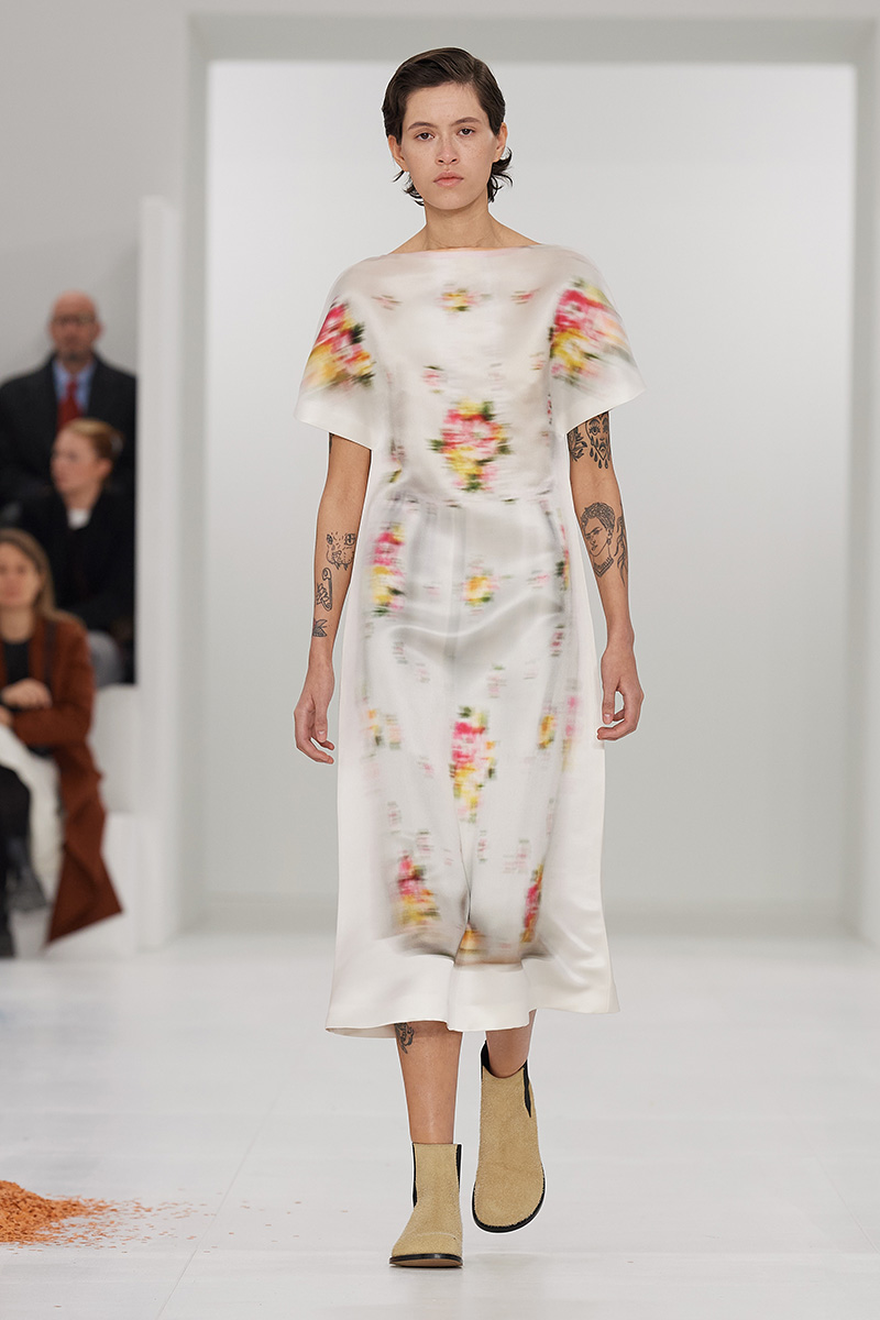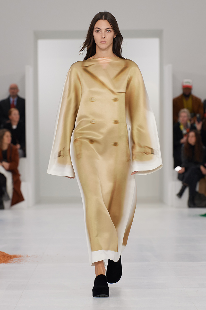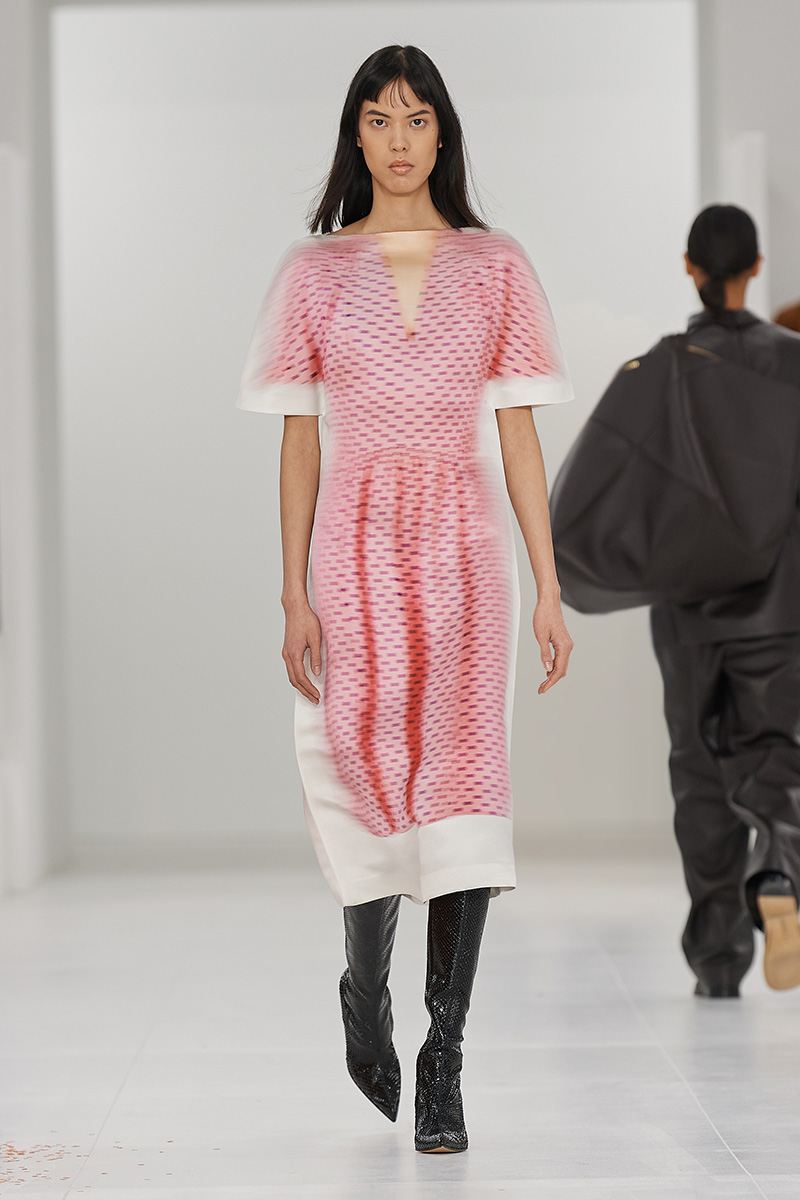 Loewe bajo la dirección de Jonathan Anderson siempre ha dado de que hablar por el juego entre la realidad y el surrealismo. Para esta iteración, Loewe mujer FW23 presenta una serie de vestidos, gabardinas y abrigos impresos de manera difuminada sobre vestidos túnica en blanco y de cortes muy holgados; hay opciones en manga larga y corta, según qué prenda esté impresa. Estas son las prendas que reiteran ese discurso sobre que una colección presentada en la pasarela no es una cosa del presente… sino lo que será una cosa del futuro próximo.