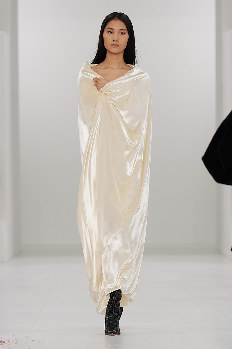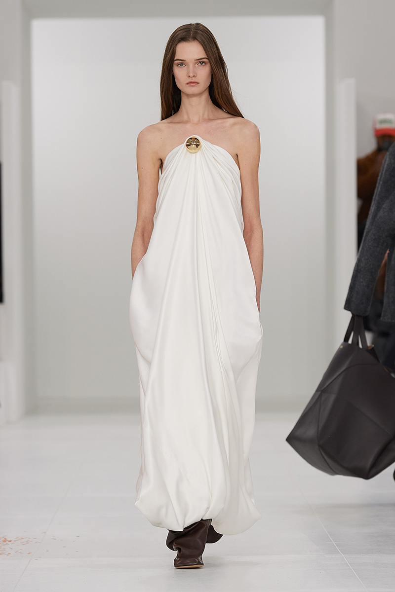 Si Anderson quería hacer hincapié en cómo la luz afecta a las prendas no lo podría haber hecho mejor que con los vestidos lenceros en seda que vimos en Loewe mujer FW23. De corte simple, pero con un drapeado y siluetas rectas increíbles, estos vestidos aportaron un grado de sofisticación y elegancia bastante necesario. También vimos híbridos de vestidos camiseros en satén; para los que quieren algo con un twist.
