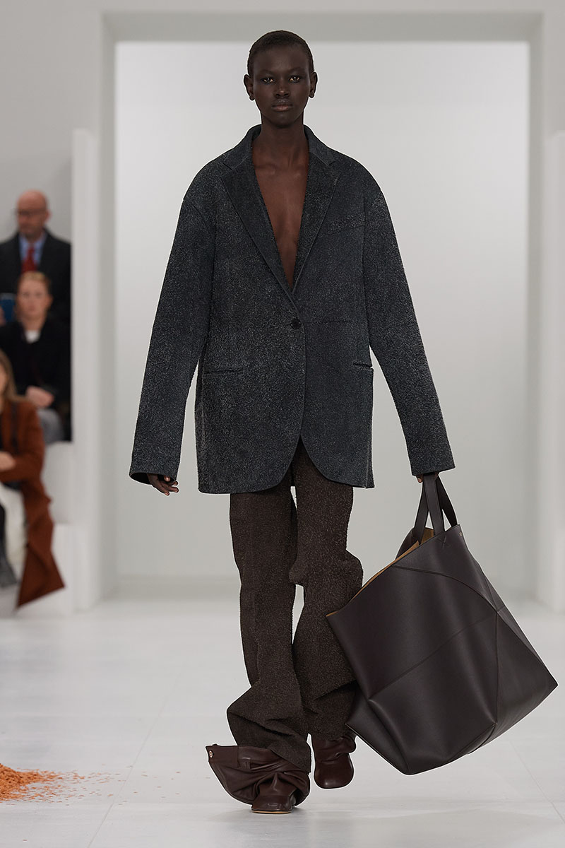 Otro punto fuerte de la colección Loewe mujer FW23 fue su reinterpretación de elementos típicos del armario masculino. Staples como americanas desestructuradas en tweed y conjuntos en punto de cashmere que transformaban al cárdigan en vestidos fueron las estrellas poco notadas de la colección.