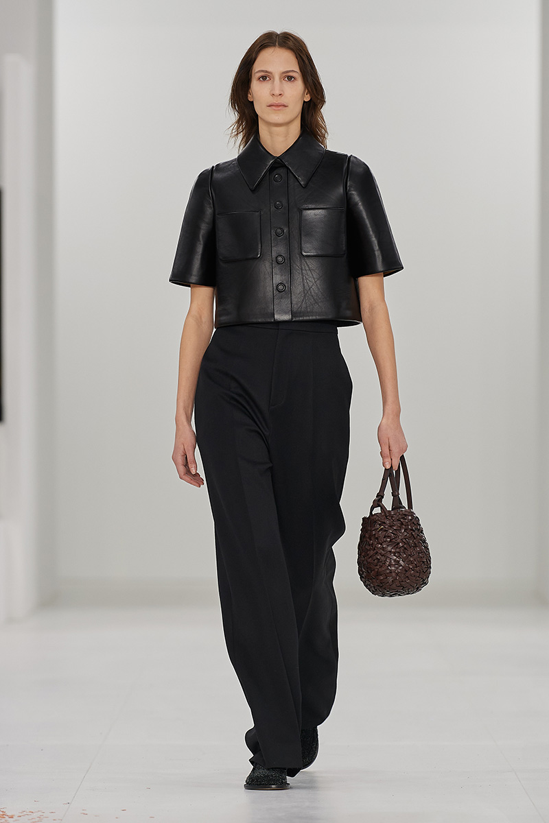 Por otro lado, tenemos también una serie de prendas en piel más serias y realistas. Loewe mujer FW23 propone como punto más sofisticado una serie de tops camiseros de cuello Mao, un conjunto de cuello mock con pantalones rectos y abrigos en piel negra. Todo súper minimalista, pero con un juego visual espectacular y muy rico.