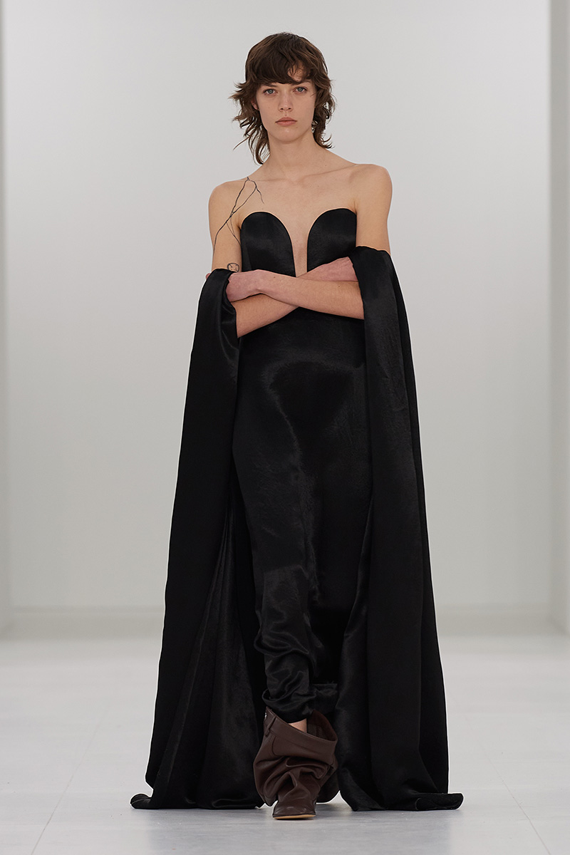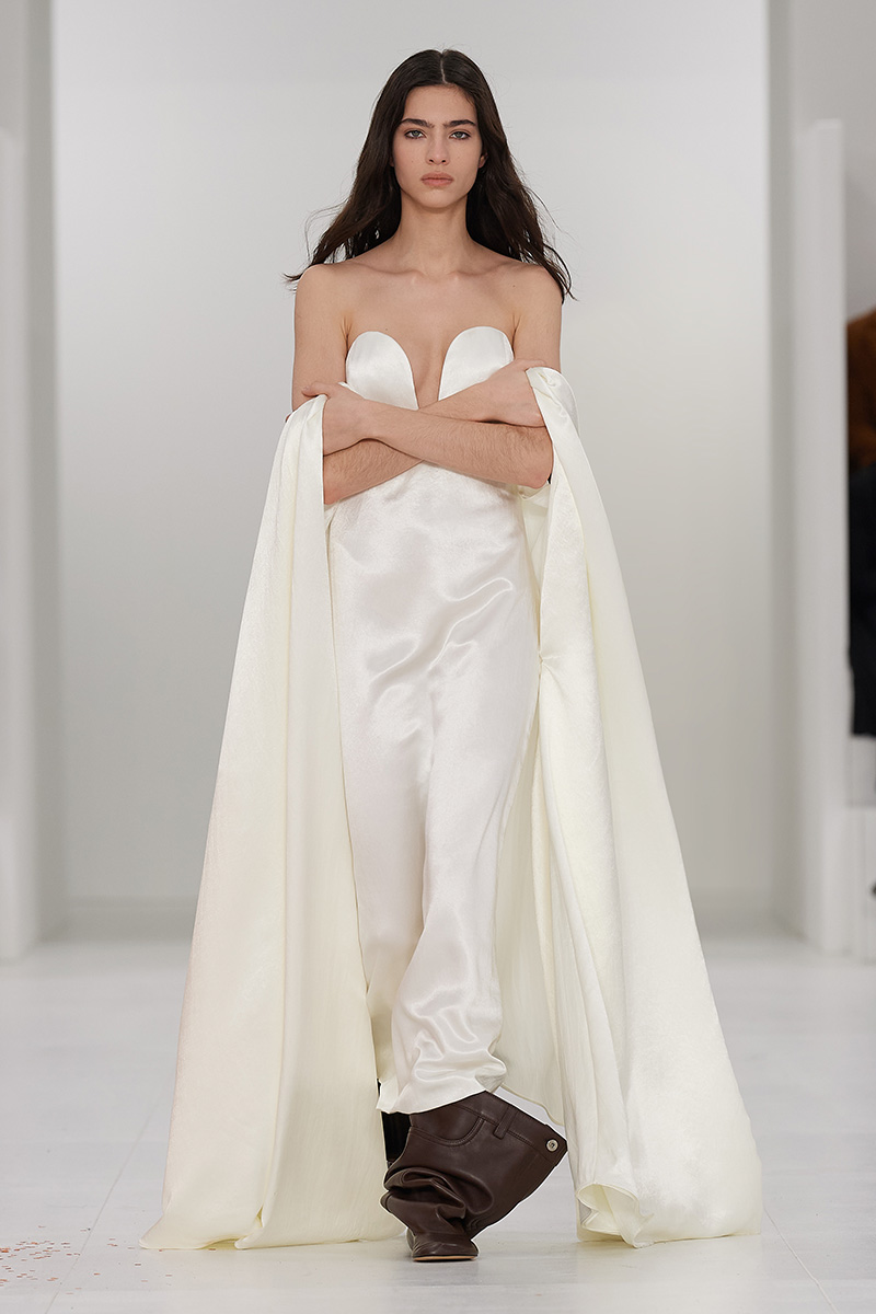 Siguiendo esta línea del menos es más Loewe mujer FW23 se centra en la idea de una sola pieza como elemento constitutivo del look de pasarela. Nada más que lo estrictamente necesario. Podría traducirse a un solo detalle, a un gesto… a un alfiler que recoge volumen. Ahora las siluetas se compactan para denotar, y resaltar, un sentido de fluidez y verticalidad sin dar la sensación de constricción.