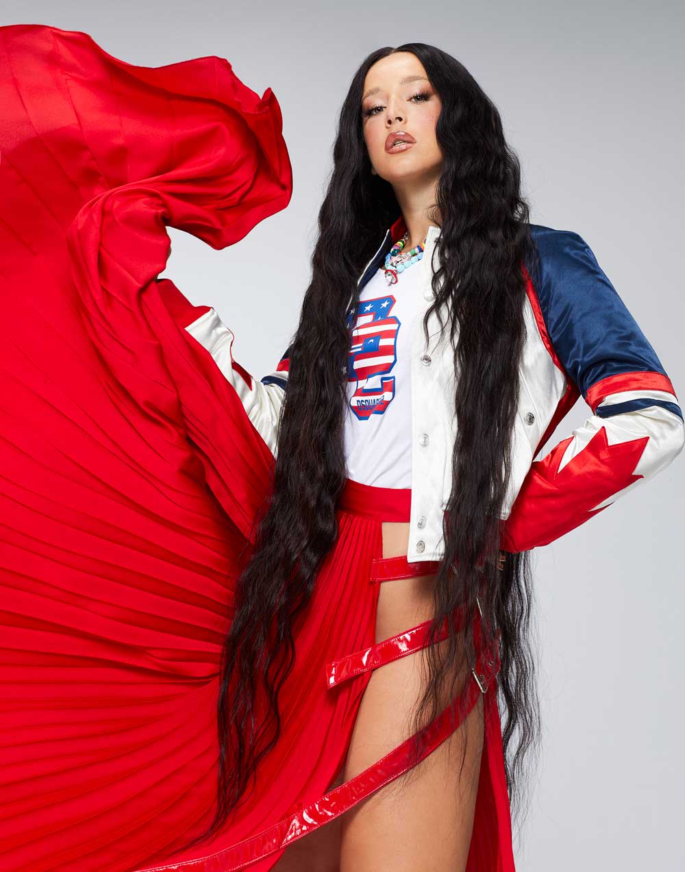 Lola Índigo con camiseta y bomber DSQUARED2, falda plisada VISORI STUDIO, collares TWOJEYS, calcetines URBAN OUTFITTERS y sandalias rojas MANOLO BLAHNIK