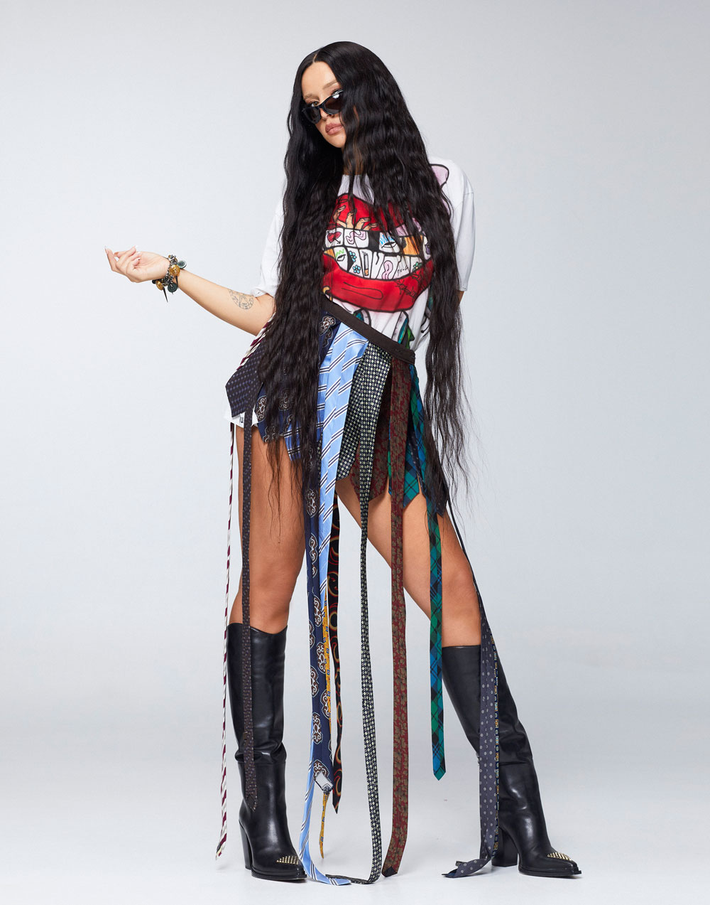 Lola Índigo con gafas BALENCIAGA, camiseta, falda de corbatas y collar de chapas en muñeca JUAN VG DESIGNER