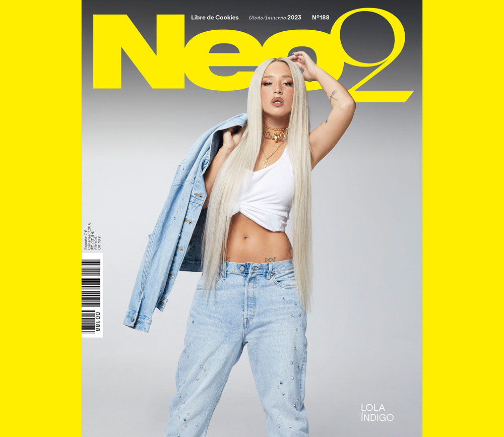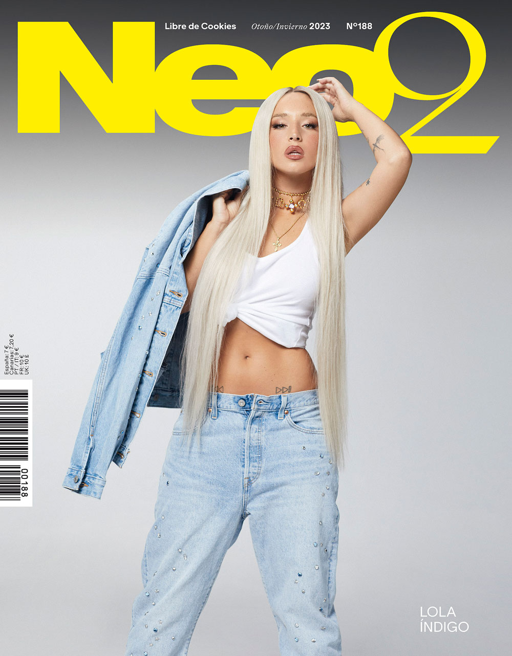 Lola Índigo en portada de Neo2 con total look LEVI’S (Chaqueta Trucker de los 90 + Jeans 501 + Camiseta Essential Rib Tank) y pulsera a modo de choker TOUS