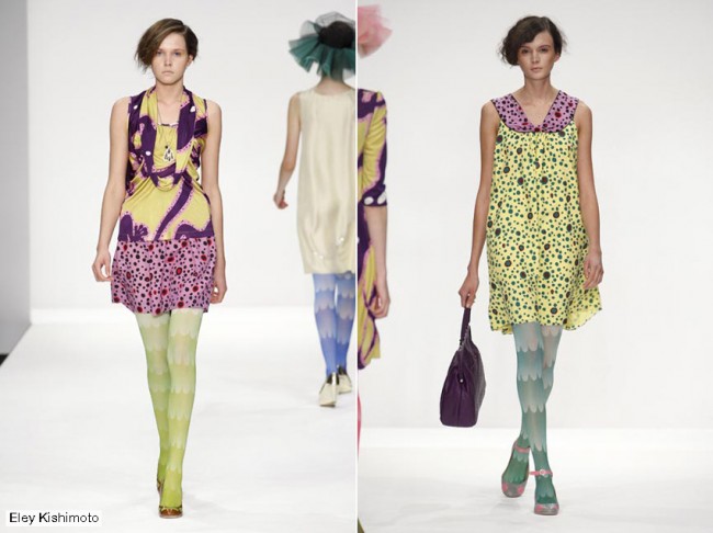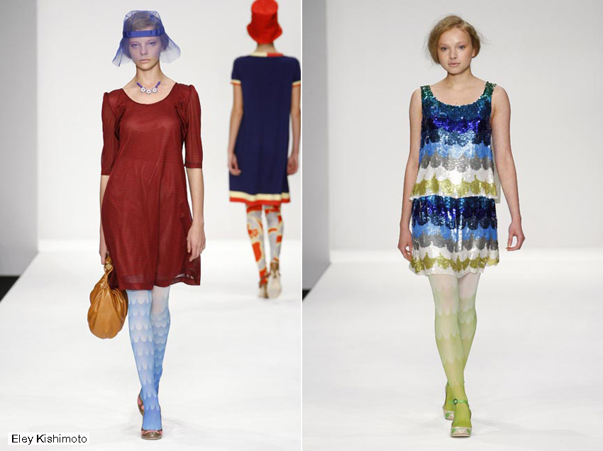 Igualmente desables eran las medias degradadas de nubes de Eley Kishimoto, en un momento en el que la prensa especializada catapulta la tendencia de las medias de colores y estampadas como clave para los tiempos que vienen, ya que es una de esas pequeñas cosas que todos nos podemos permitir y que cambia por completo cualquier look. Quizás se conviertan en el equivalente de los pintalabios rojos en tiempos de guerra – pequeños lujos para todos los bolsillos.
