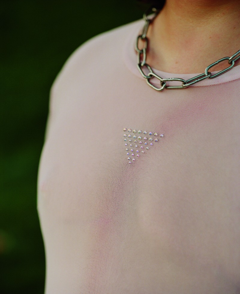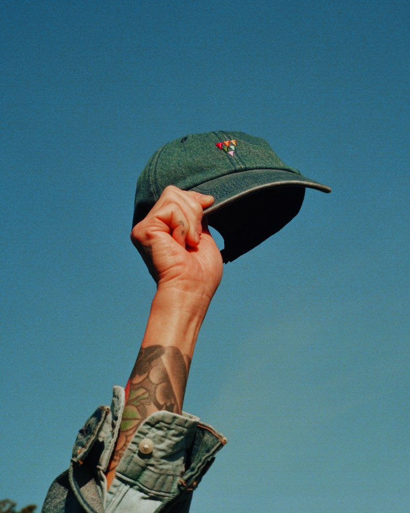 En las prendas denim, el triángulo rosa está presente tanto en camisetas como en gorras.