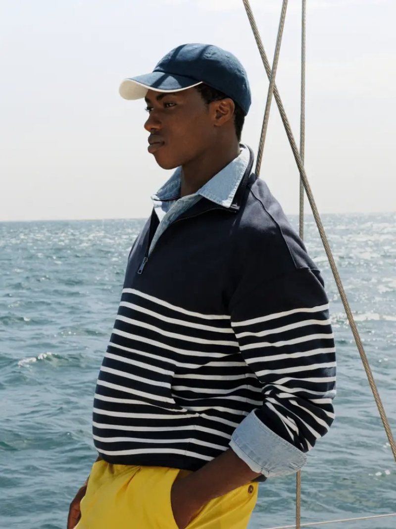 En cuanto a los looks de estilo marinero femeninos, la cápsula presenta la harrington verde en formato cropped como estrella. También, tenemos una sudadera extra larga que hace de vestido sport y camisetas y prendas de punto que siguen esa misma línea cropped. Y si lo que quieres es el cliché de lo marinero, también hay camisetas a rayas; no te preocupes.