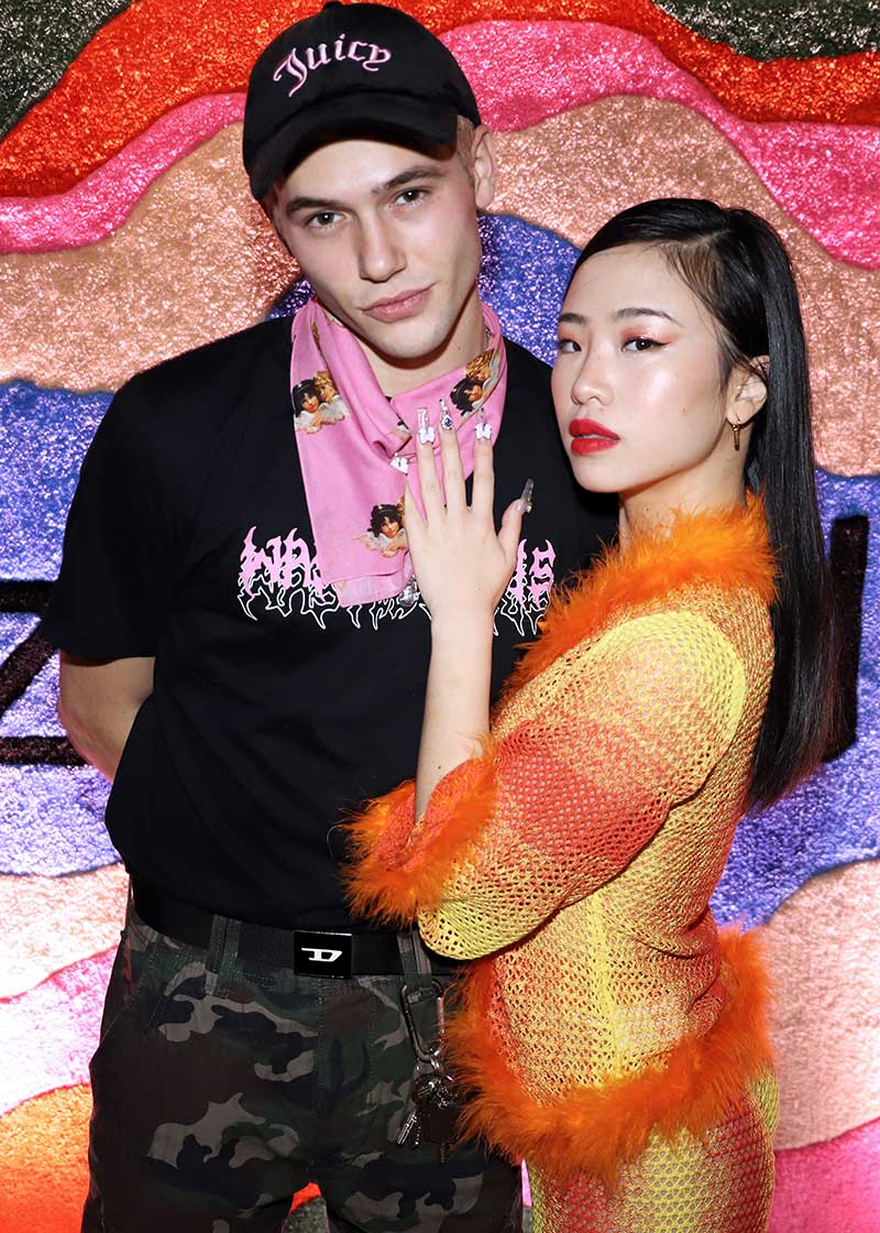 El color pieza clave en los looks más modernos de famosos para salir de fiesta. En la foto: Julio Taeno con camiseta Wasted Paris (27,95€), gorra de Juicy (29.95€), pantalón Brandit (59.99€) / Songa: Chaqueta y pantalón de punto Sinead Gorey