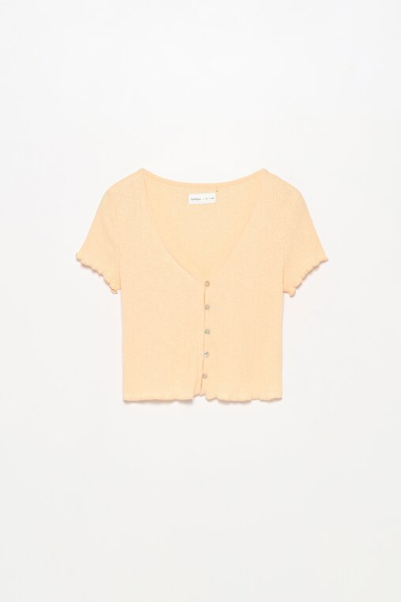 Seguimos con otro básico, porque este manual de estilo para looks de verano caluroso es así. Aquí no te vas a encontrar estampados o colores complicados, aquí solo tonos suaves. Por ejemplo esta camiseta con botones de manga corta que es muy estilo coquette. ¿Quién no la quiere llevar?