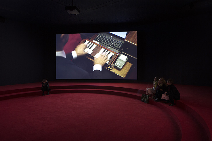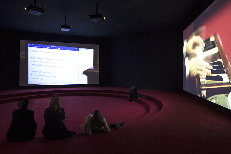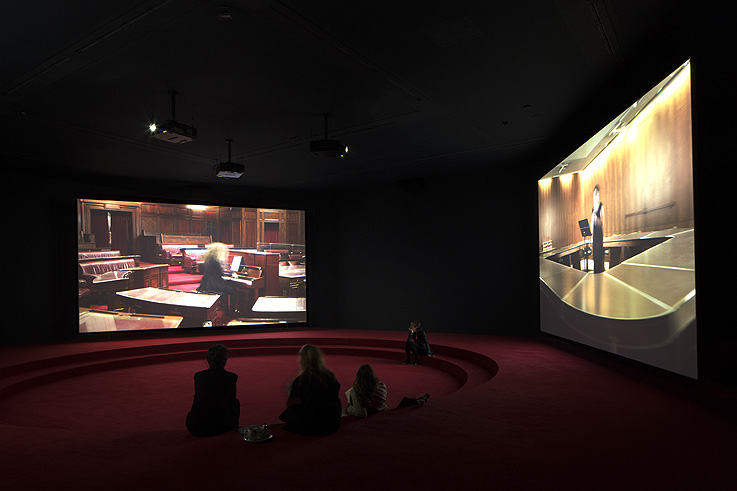 Angelica Mesiti ha querido convertir el pabellón australiano en una especie de espacio para la comunidad y la democracia. Para ello ha construido una suerte de ágora o anfiteatro de moqueta roja en el que el espectador puede sentarse a ver el video de tres pantallas que rodean el lugar. En él, la artista se adentra en el Senado italiano y australiano para presentarnos Michela, un estenotipo inventado en el siglo XIX para transcribir los debates parlamentarios. Partiendo de este aparato, Meseti ha transcrito un poema de David Malouf que el compositor Max Lyandvert ha transformado en una opera que resuena en la sala ofreciendo una reflexión sobre la universalidad del lenguaje y los límites de la traducción, el diálogo y la comunicación.