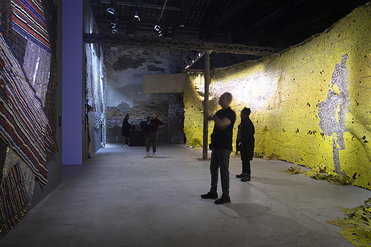 Aunque solo sea por el maravilloso – como siempre- video “Sea of Whiteness”, de John Akomfrah, vale la pena destacar esta apuesta de Ghana. Pero es que además, en su primera participación como pabellón nacional, el país africano ofrece un recorrido algo laberíntico y sinuoso, muy bien diseñado por David Adjaye, en el que destacan los interesantes retratos pintados por Lynette Yiadom-Boakye –en el 2020 veremos una retrospectiva suya en la Tate Britain- o el mural instalativo, hecho con tapones de botellas, de El Anatsui. Sin olvidar “A Straight Line through the Carcass of History 1649 (2016–19)”, la espectacular construcción de madera de Ibrahim Mahama. Un pabellón algo oscuro y recargado pero definitivamente potente y muy bien trabajado que se debería llevar el premio a mejor pabellón revelación, si este existiese. Y un gran homenaje también a Okwui Enwezor, al cual está dedicado.