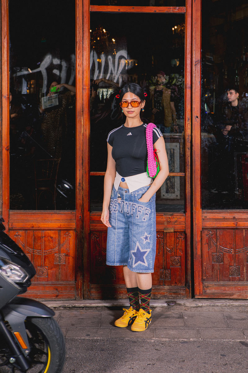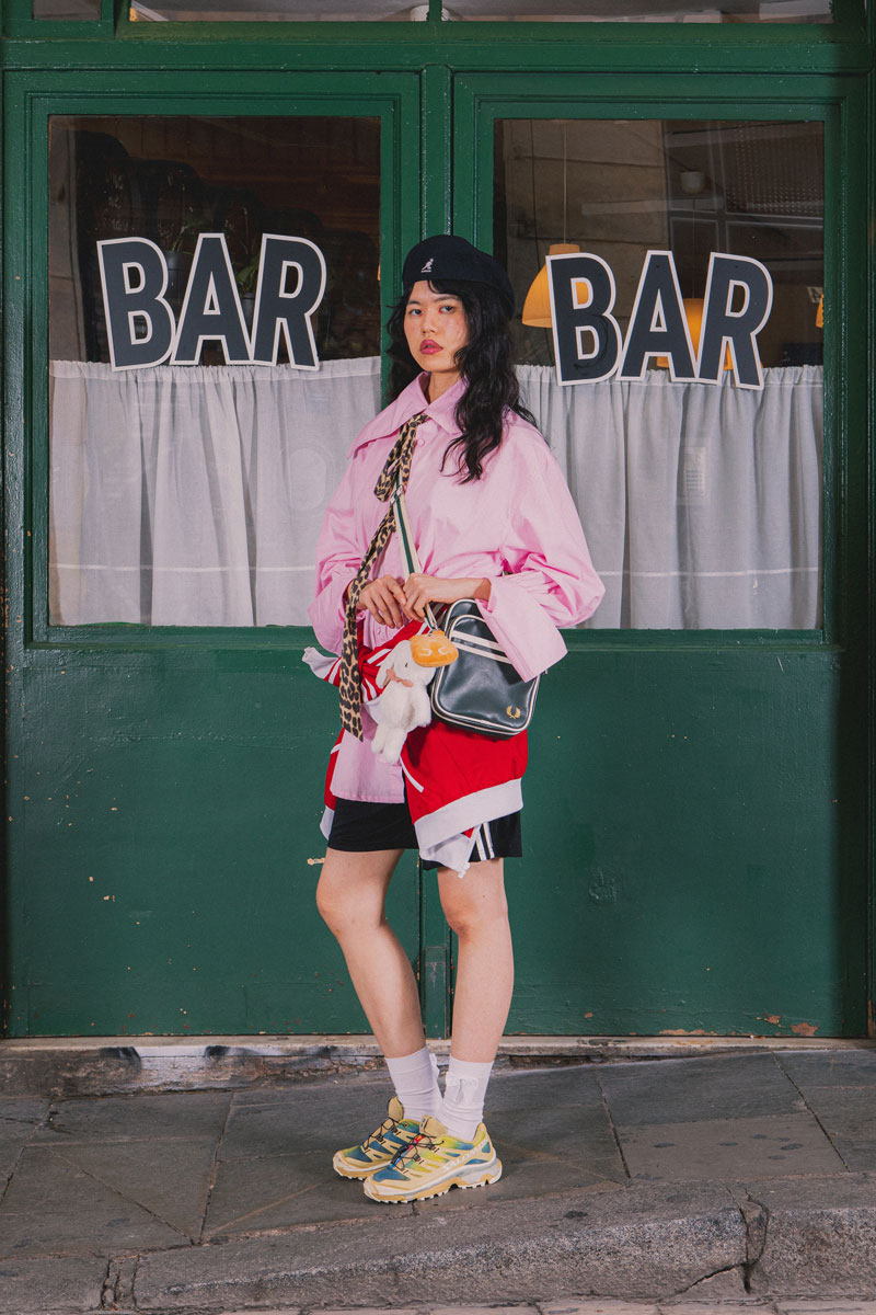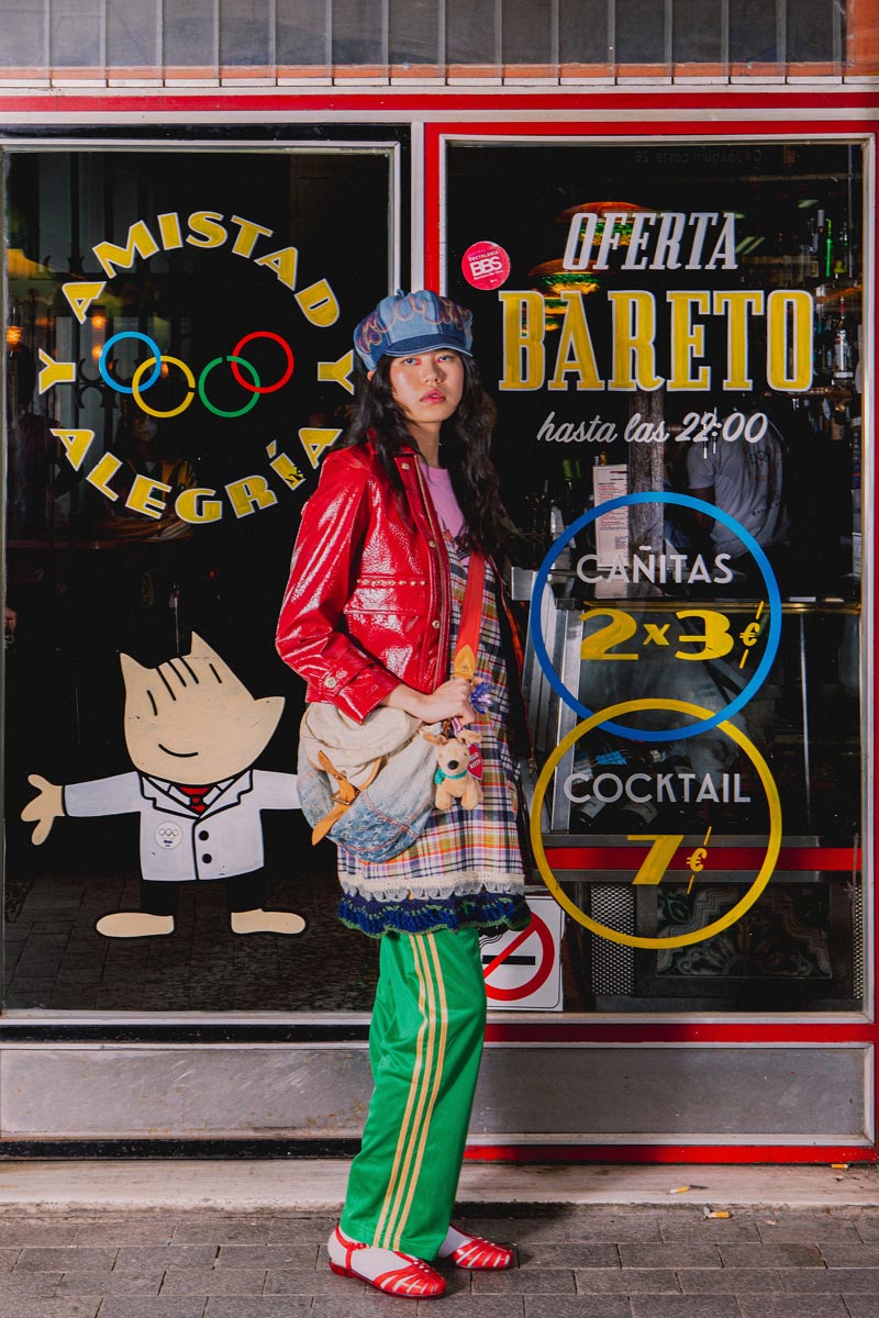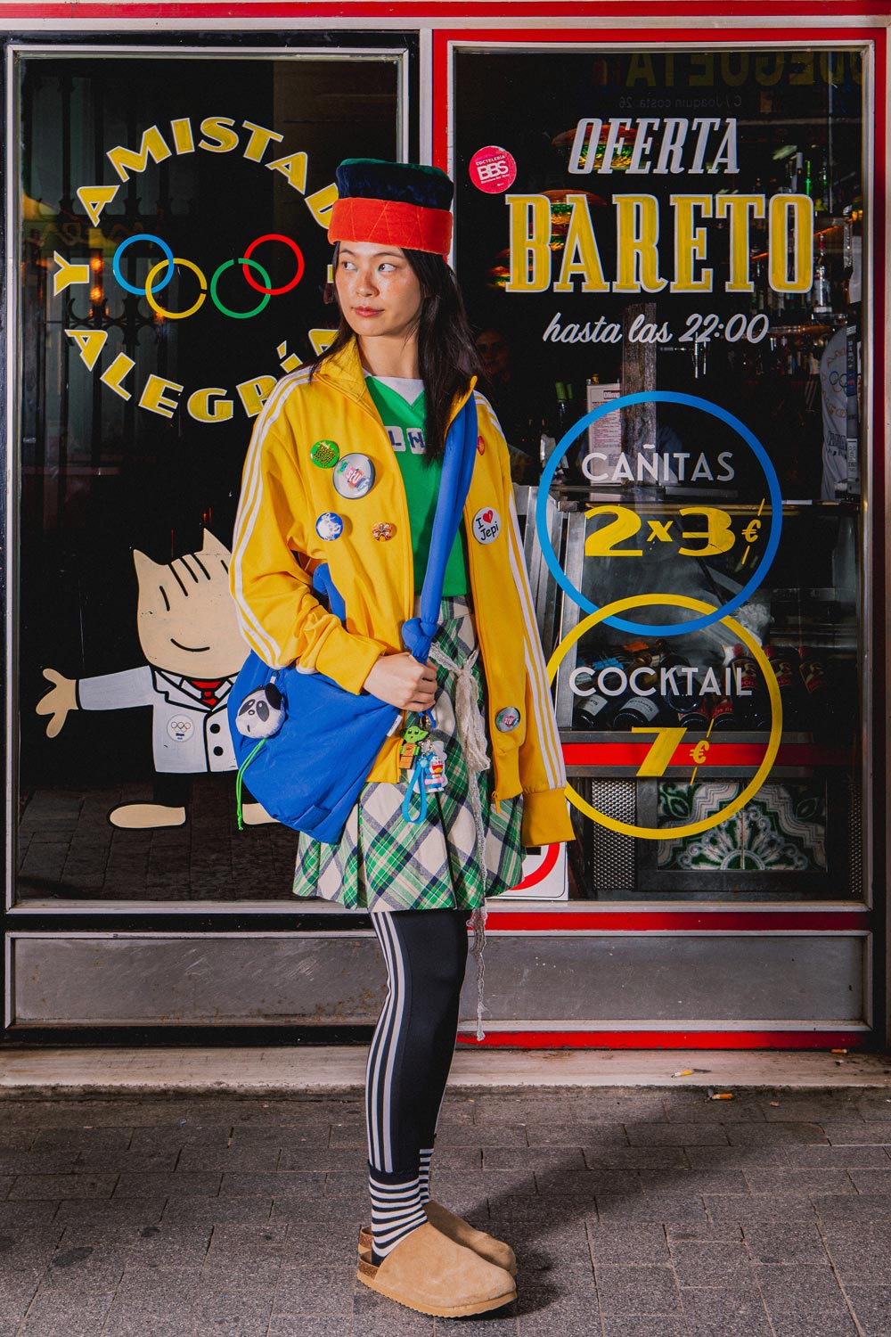 Wan en el bar Olimpic: Chaqueta ADIDAS ORIGINALS + Camiseta EL NIÑO + Falda NEY NEY ARCHIVE + Leggings ADIDAS ORIGINALS + Zuecos BIRKENSTOCK + Polo ÖLEND + Sombrero PARDO HATS + Pins SSSTUFFF