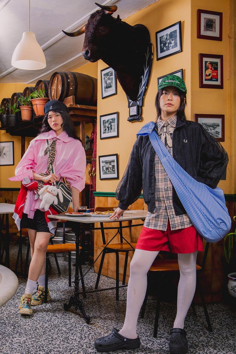 Wan con Chaqueta FRED PERRY + Camisa BURBERRY + Pantalón MAISON MONSIEUR + Zuecos CROCS + Bolso SSSTUFFF + Gorra BIMBA Y LOLA + Lazo MÓNICA NANTI / Yin con Camisa Le Machet + Pantalones y Chaqueta en la cintura ADIDAS ORIGINALS + Bolso FRED PERRY + Zapatillas SALOMON