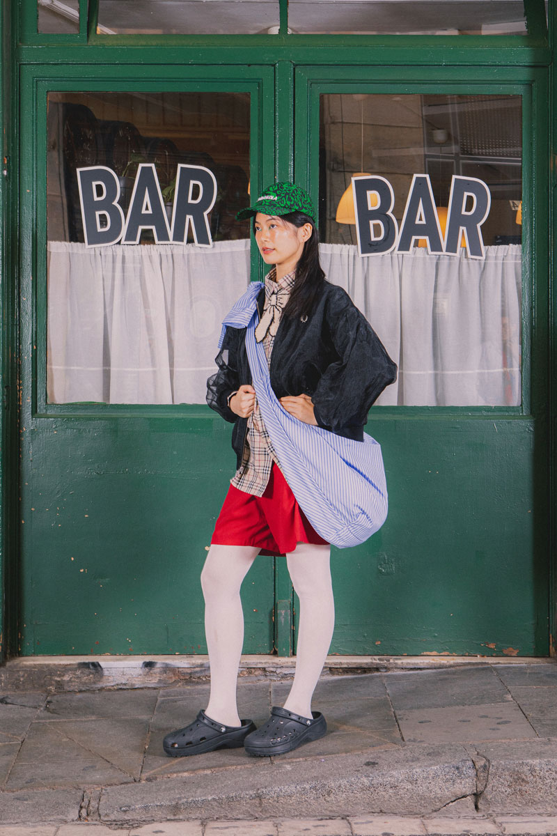 Wan de bares con Chaqueta FRED PERRY + Camisa BURBERRY + Pantalón MAISON MONSIEUR + Zuecos CROCS + Bolso SSSTUFFF + Gorra BIMBA Y LOLA + Lazo MÓNICA NANTI