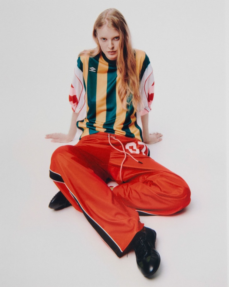 La cápsula colaborativa de Umbro X Stine Goya es de pedigrí bloke core en su totalidad; pero también es algo -muy- suyo. Este repertorio de high street abre con su look estrella: un traje de chándal técnico. Lo interesante es que aquí vemos mucho más que solo un colorblocking retro de colores fuertes. Por ejemplo, la chaqueta viene con cintura cinchada, que hace una falda en la espalda. El pantalón, de corte baggy, se remata con una raya track y un bajo acampanado de aire setentero. Es lo mismo; pero no del todo.