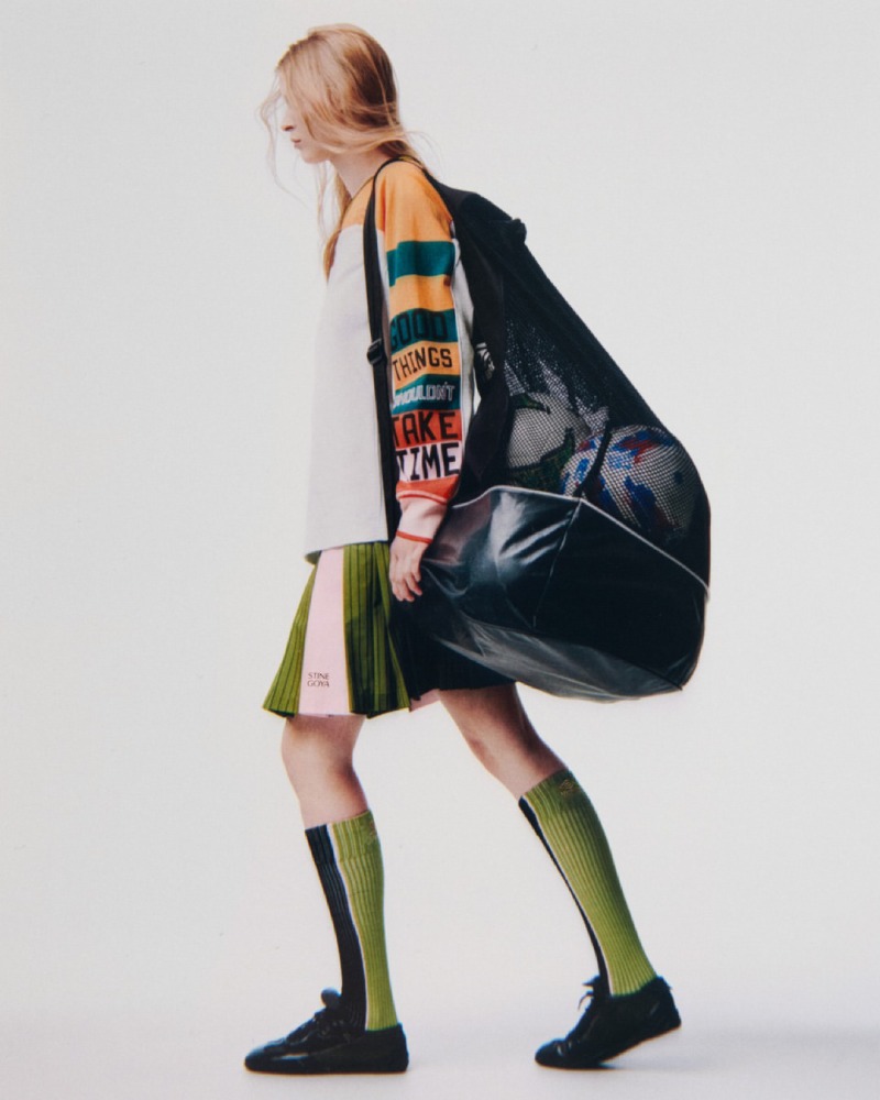 Y ya todos sabemos la fuerza que está cogiendo la tendencia futbolera; especialmente ahora que es verano. Lo interesante es que esto mismo puede verse desde un punto de vista rara vez explorado: el armario femenino. Aquí es cuando entra la nueva colaboradora de la firma de sportswear, Stine Goya. Ella, danesa, profesa una oda poco sutil a la feminidad a través de un lenguaje atrevido y súper histriónico de lo que es el womenswear. ¿La novedad de esta colabo? Pues a parte de que se ve al bloke core desde otros ojos, esta también es una de las primeras incursiones de la diseñadora a lo más street.