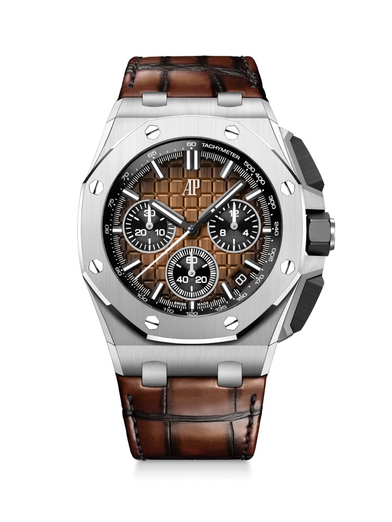 El look del habano se hace notar en la esfera. El dial, con guilloché de Méga Tapisserie, tiene un degradado de marrón a negro de espectáculo. Y, siguiendo el mismo look, tenemos una disposición horizontal de las subesferas en negro con indicadores en blanco. Como detalle especial, los índices y las agujas de oro blanco ahora se presentan ennegrecidos con un tratamiento especial para no desentonar con el look. Y, cerrándolo todo, tenemos una correa de cocodrilo tintada de marrón con su clásico cierre desplegable AP.