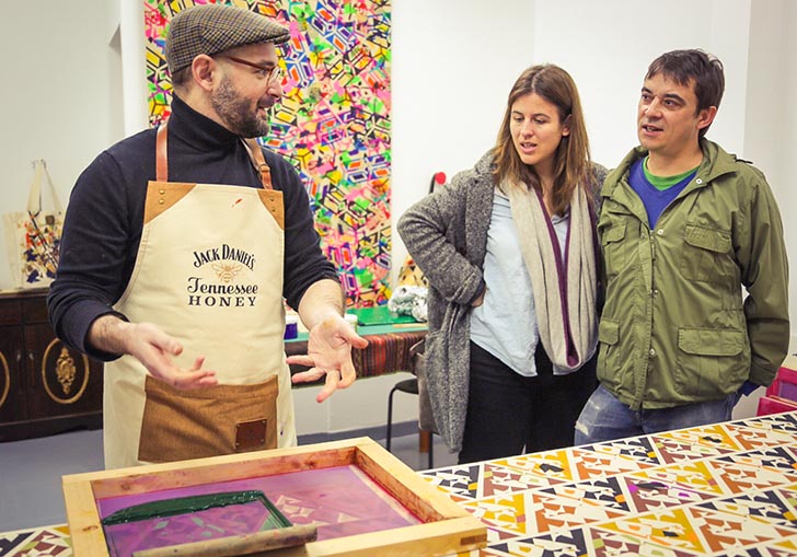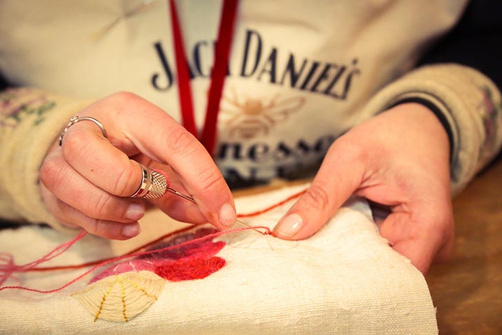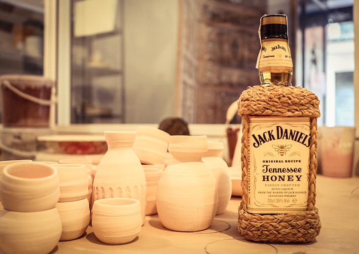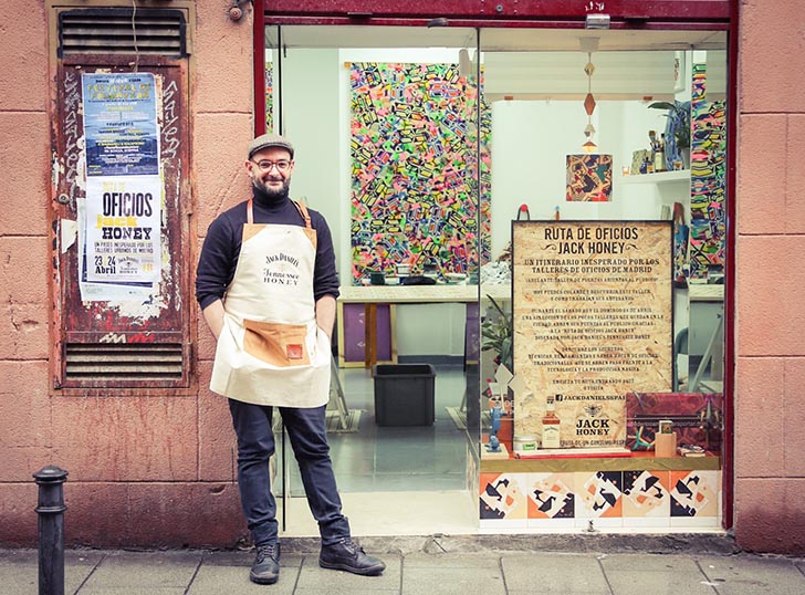 Organizamos una ruta y seleccionamos una pequeña representación de las maravillas que Jack Honey nos ofrecía. Nuestra primera parada fue el taller de estampación de Federico Antelo (c/ Juanelo nº13). Nada más llegar probamos un chupito congelado de Jack Daniel’s Honey para disfrutar mejor de la experiencia. Federico estaba trabajando sobre un gran telar de algodón en el que iba estampando coloridas formas geométricas mientras nos hacía partícipes del proceso. El resultado: una pieza digna de museo. Siguiendo con nuestro recorrido llegamos a la calle Encomienda nº13, donde se encuentra Yolanda Andrés y su fábrica de sueños bordados. Un espacio en el que se respira a la vez modernidad y tradición. El bordado, y todo tipo de técnicas abuelísticas, vuelven a ser un must (sino que se lo digan a las it-girls de Coachella). Con todas las paredes recubiertas con sus obras, Yolanda nos invitó a entrar en su mundo hilado. Cada de uno de los objetos que vemos es el fruto de pacientes horas y horas de trabajo.