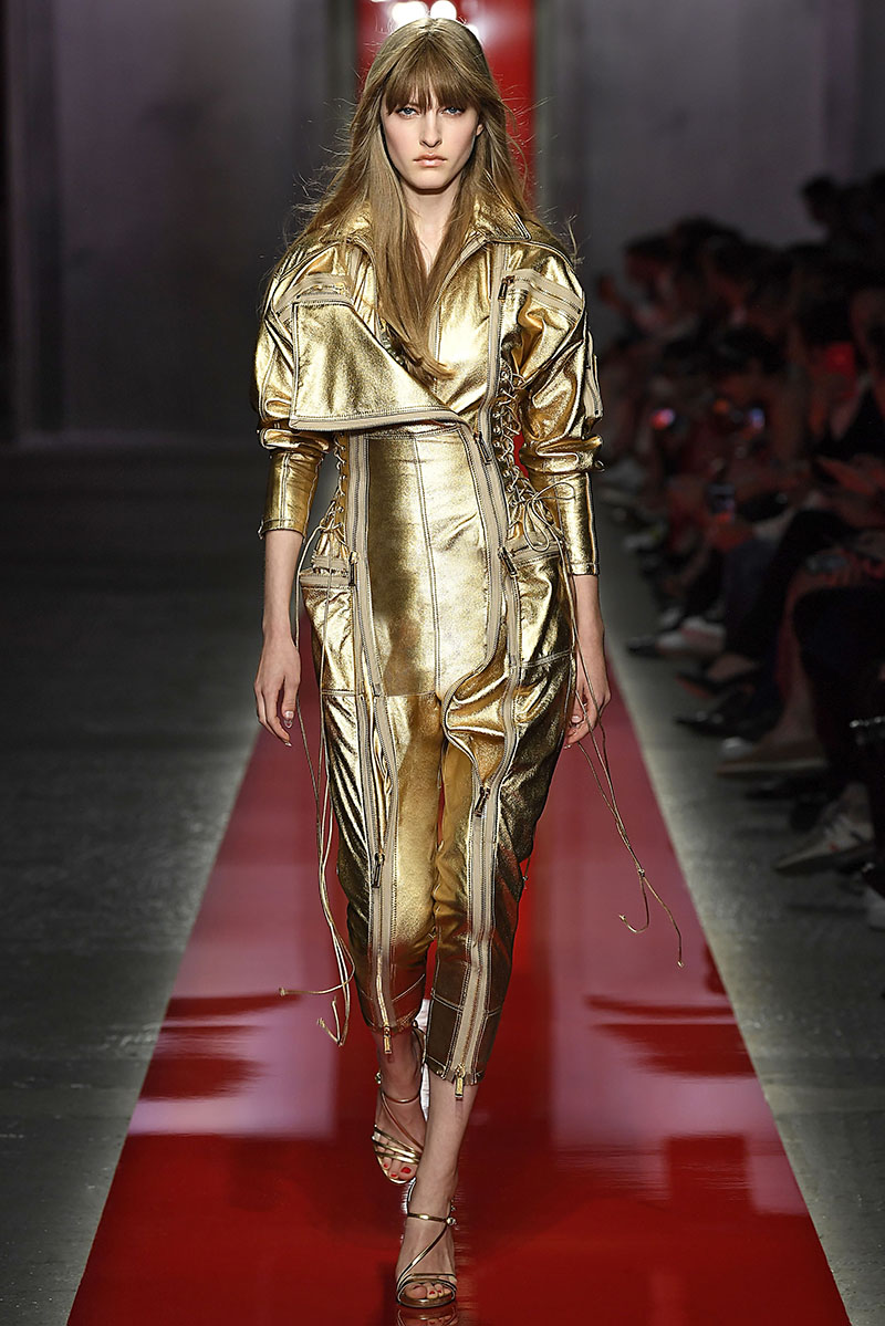 Entre las piezas que forman los conjuntos de noche destacan las camisetas de tirantes en tul transparente y otras partes de arriba bordadas con tiras impresas llenas de colores y brillos. También destaca una chaqueta confeccionada mitad lana mitad satén con estampado floral, las perfecto con cuellos de chal y otros modelos sin mangas con cuello tortuga. Un kimono reversible estilo plumífero se convierte en una de las piezas más complejas e interesantes. Las cremalleras y los cordones se incluyen como novedad en jerseys hechos a partir de nylon azul para hombre y en tonos dorados para mujer.
