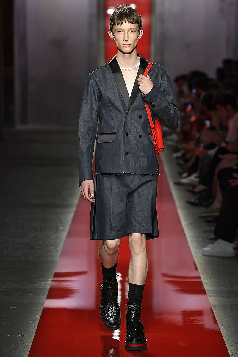 El calzado se llena de tejidos trenzados en zapatos de cuero y sandalias con suela gruesa. En los frontales se incluyen lineas azules y rojas. En esta nueva colección de Dsquared2 SS20 el bolso clave de la marca viene como un rectángulo compacto con una larga tira para poder llevarlo como quieras.