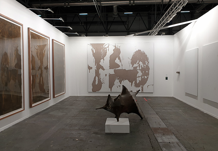 Sutil, minimal, limpio y profundo. Nada que objetar a esta maravilla (y no es la primera) de la galería Heinrich Ehrhardt. Los tonos beige, marrones o castaños de Secundino Hernández y Günther Förg se funden con el blanco manchado y la bolsa de tierra de Fernando García en un interior despejado y aéreo que permite al espectador tener el tiempo y el espacio suficiente para poder disfrutar de los cuadros. En su centro, una escultura enigmática y algo marciana de Georg Herold se presenta como el contrapunto material perfecto a la evanescencia de los cuadros. Los colores vivos se han dejado para el muro exterior con dos maravillosas propuestas; los característicos trazos punzantes y coloridos de Thilo Heinzmann y una hipnótica composición de degradados de verdes a cargo de Juliao Sarmento. Un oasis de calma que destaca aún más si cabe por su cercanía con la copiosa oferta de Elvira González y Parra & Romero (con artistas muy interesantes ambos, esa no es la cuestión).